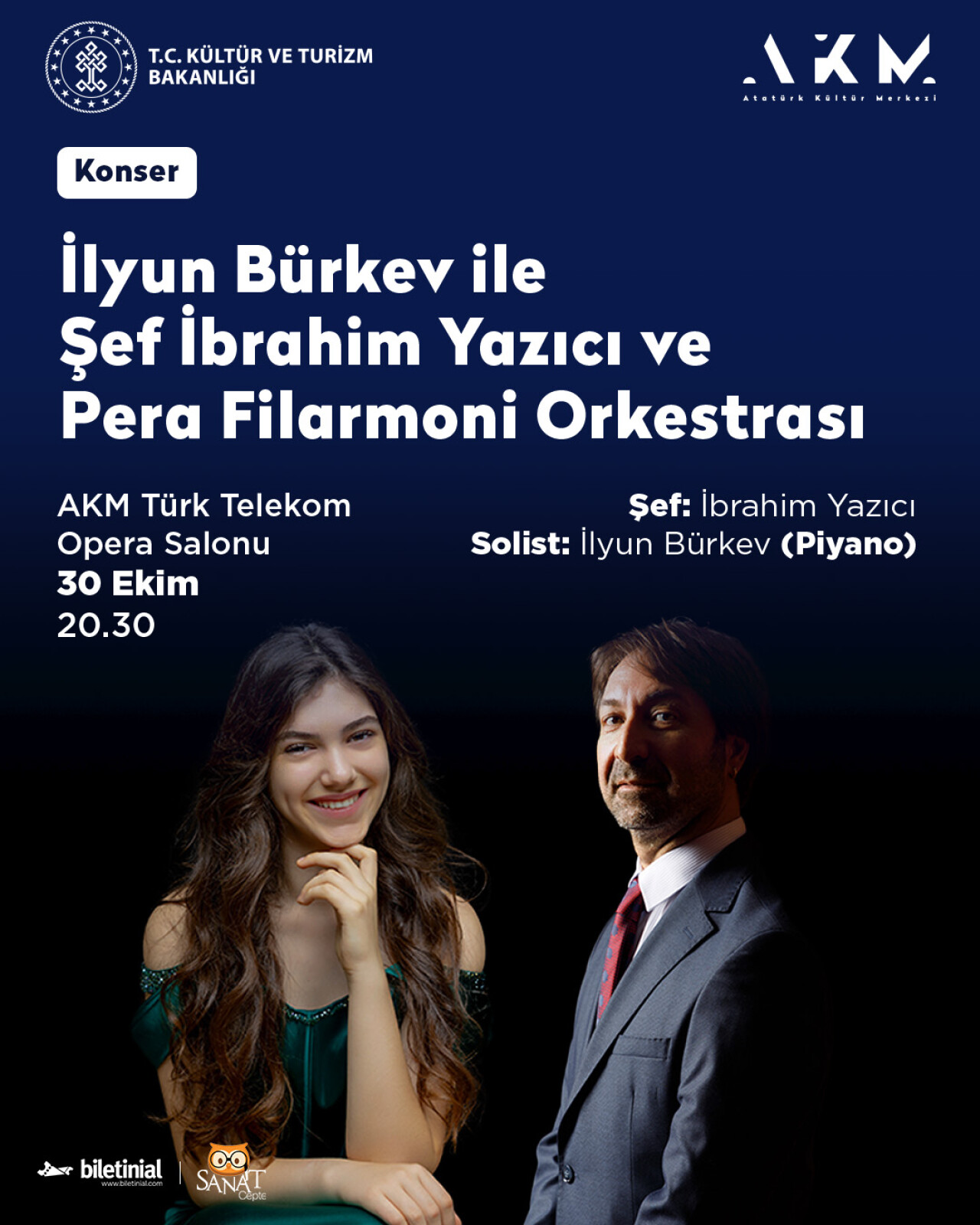 Yurtiçinde ve yurtdışında elde ettiği başarılarla ve ödülleriyle adından çokça söz ettiren genç yetenek İlyun Bürkev, Şef İbrahim Yazıcı yönetiminde, Pera Filarmoni Orkestrası eşliğinde AKM Türk Telekom Opera Salonu sahnesinde muhteşem bir konsere imza atmaya hazırlanıyor. 30 Ekim Çarşamba akşamı gerçekleştirilecek konserde Bürkev, Saint-Seans’ın 2 Nolu piyano konçertosunu icra edecek. Şef İbrahim Yazıcı yönetimindeki Pera Filarmoni orkestrası konserde ayrıca L.V. Beethoven'in Prometheus üvertürü ile W. A. Mozart'ın No 41 Jüpiter senfonisini seslendirecek.