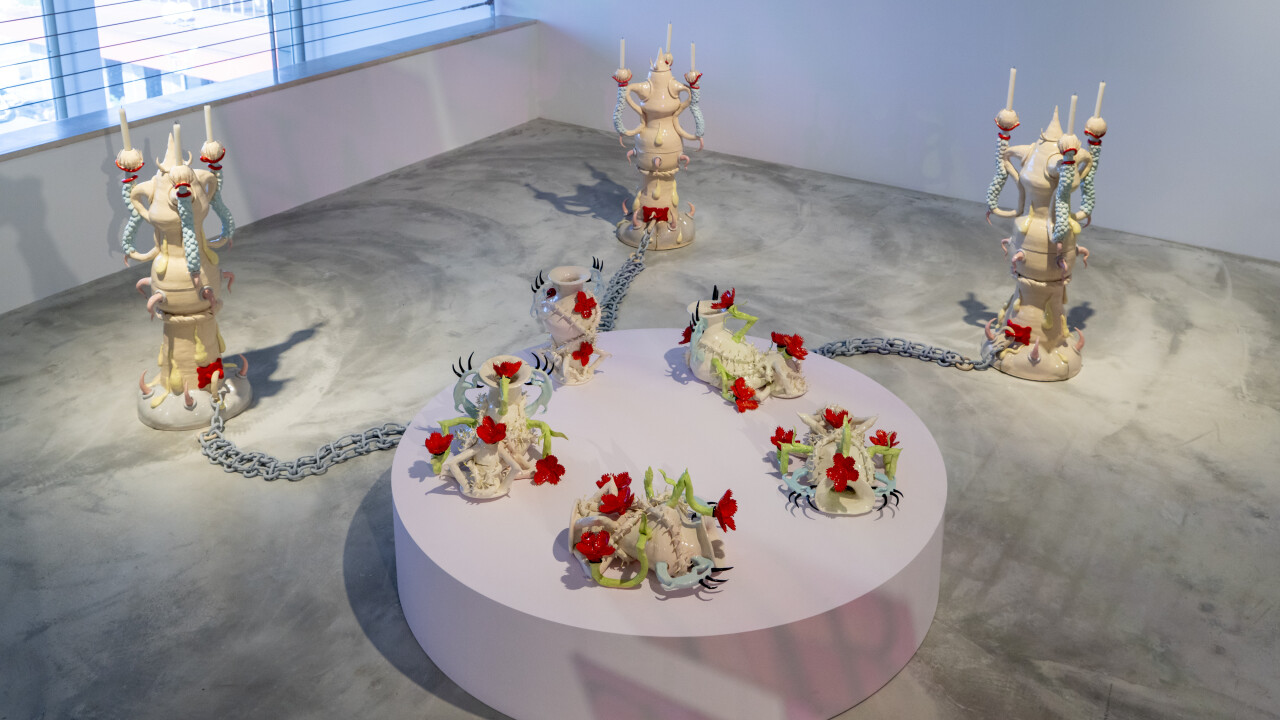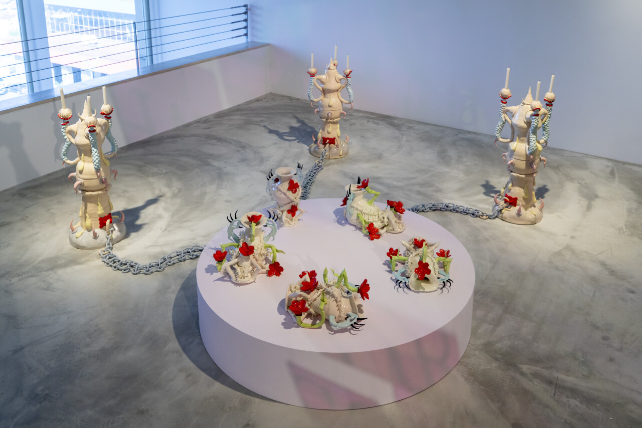 Metehan Törer’in sergide yer alan Yeryüzüne Doğanlar (2023) başlıklı yerleştirmesi ise nesilden nesile aktarılan bilgi ve hafızanın izini seramikler aracılığıyla sürüyor. SVİKV Kütahya Çini ve Seramikleri Koleksiyonu’ndan 1950’lere tarihlenen çift kulplu vazoyu esin kaynağı olarak alan çalışma, bedeni andıran farklı formlarda zemine uzanmış vazolar ve etraflarına konumlandırılan anıtsı şamdanlardan oluşuyor. Seramik yüzeyini desenlemek yerine boyutlandırarak çalışan Törer, kırık karanfil motifini yerleştirmenin temel unsurlarından biri olarak kullanıyor. Koleksiyondaki objelerde de sıkça yer alan bu motifin ‘fani dünya’ veya ‘manevi aşk’ı temsil ettiği düşünülüyor. Zincirlerle birbirlerine bağlanan figürlerden oluşan bir ritüel alanını andıran Yeryüzüne Doğanlar, kuir beden hafızasını seramik nesnelerde yeniden canlandırıyor.