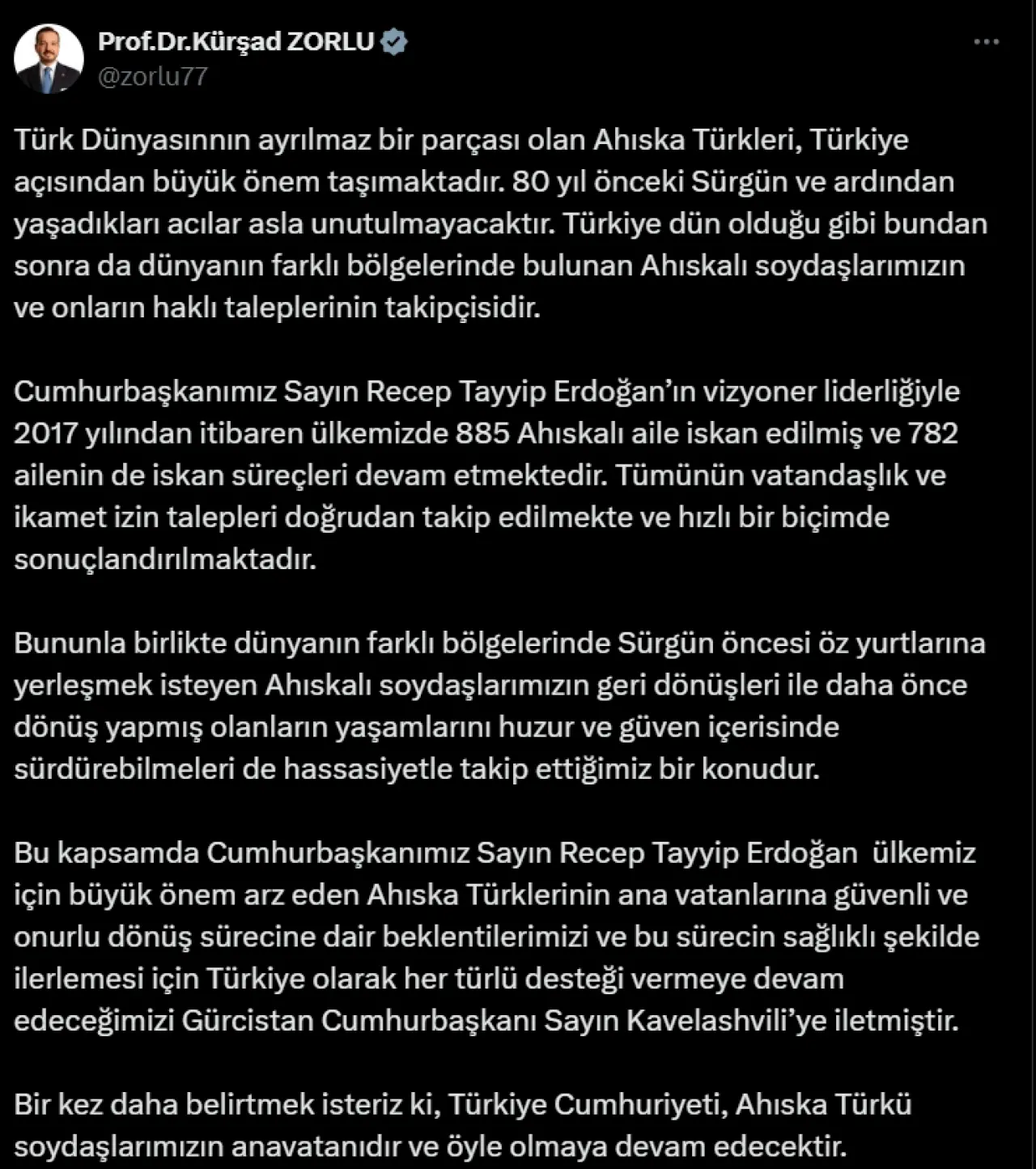 Zorlu, açıklamasını şu şekilde sonlandırdı, “Bir kez daha belirtmek isteriz ki, Türkiye Cumhuriyeti, Ahıska Türkü soydaşlarımızın anavatanıdır ve öyle olmaya devam edecektir.”
