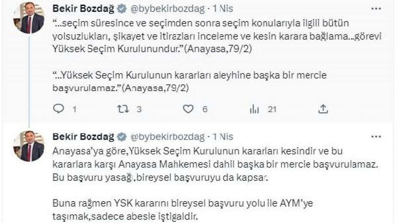 Adalet Bakanı Bekir Bozdağ, Twitter hesabından açıklamada bulundu. Bozdağ, Anayasa'nın 'Seçim süresince ve seçimden sonra seçim konularıyla ilgili bütün yolsuzlukları, şikayet ve itirazları inceleme ve kesin karara bağlama görevi YSK'nındır. YSK'nın kararları aleyhine başka bir mercie başvurulamaz' yönündeki maddesini hatırlatarak, "Anayasa’ya göre, YSK'nın kararları kesindir ve bu kararlara karşı AYM dahil başka bir mercie başvurulamaz. Bu başvuru yasağı, bireysel başvuruyu da kapsar. Buna rağmen YSK kararını bireysel başvuru yolu ile AYM’ye taşımak sadece abesle iştigaldir" ifadelerini kullandı.
