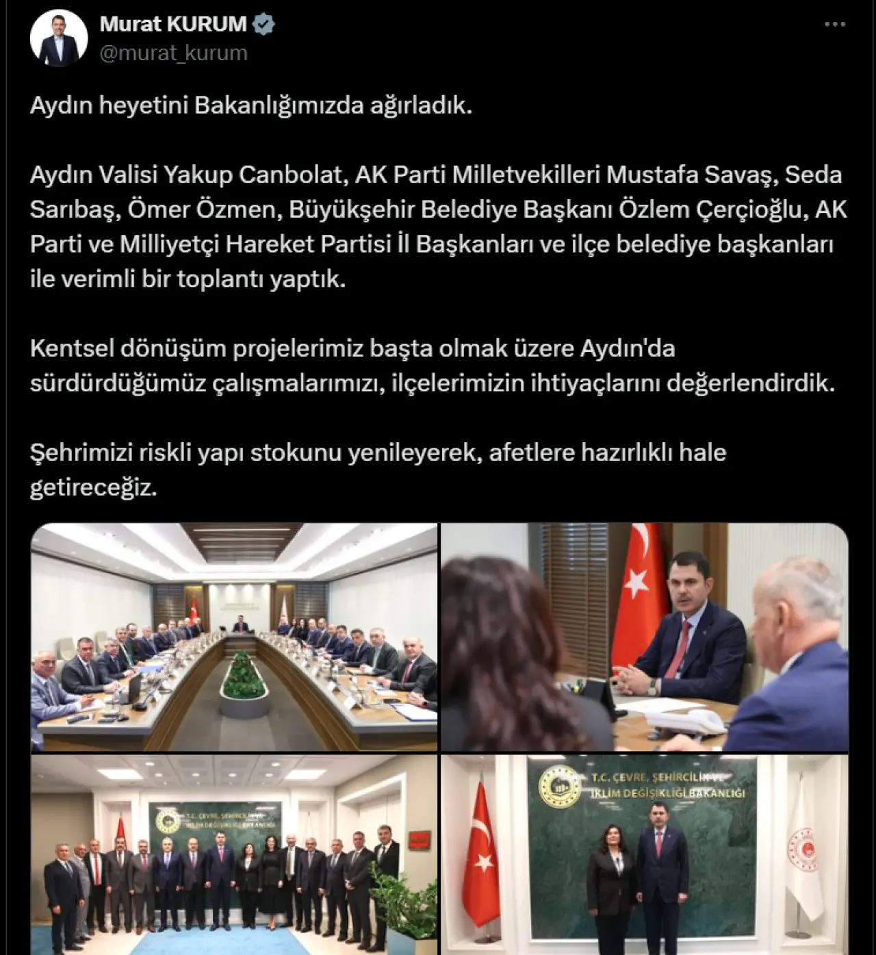 Çevre, Şehircilik ve İklim Değişikliği Bakanı Murat Kurum, sosyal medya hesabı X üzerinden yaptığı paylaşımda, Aydın heyetini bakanlıkta ağırladığını duyurdu.