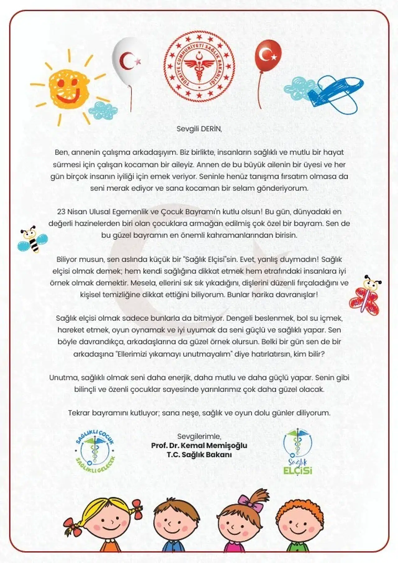 Sağlık Bakanı Kemal Memişoğlu, bakanlık bünyesinde görev yapan personelin çocuklarına gönderdiği mektupla 23 Nisan coşkusuna ortak oldu.