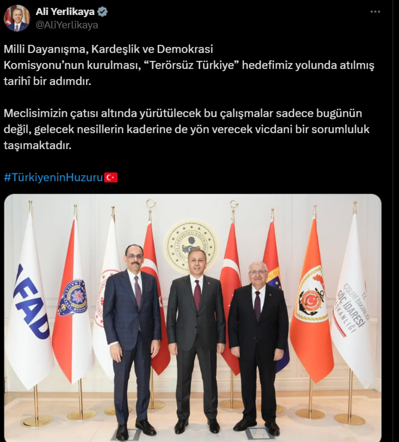İçişleri Bakanı Ali Yerlikaya, sosyal medya hesabı X üzerinden yaptığı açıklamada, “Milli Dayanışma, Kardeşlik ve Demokrasi Komisyonu’nun kurulması, “Terörsüz Türkiye” hedefimiz yolunda atılmış tarihî bir adımdır.” dedi.