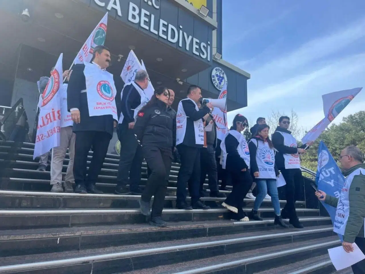 Buca Belediyesi’nde çalışan memurların, 7 aylık geriye dönük sosyal denge tazminatlarının ödenmediği belirtildi. Eyleme Tüm Bel-Sen İzmir 2 No’lu Şube, Tüm Yerel Sen İzmir 2 No’lu Şube ve Birlik Yerel-Sen’e bağlı memurlar katıldı. Katılımcılar bina önünde bir araya gelerek slogan attı.