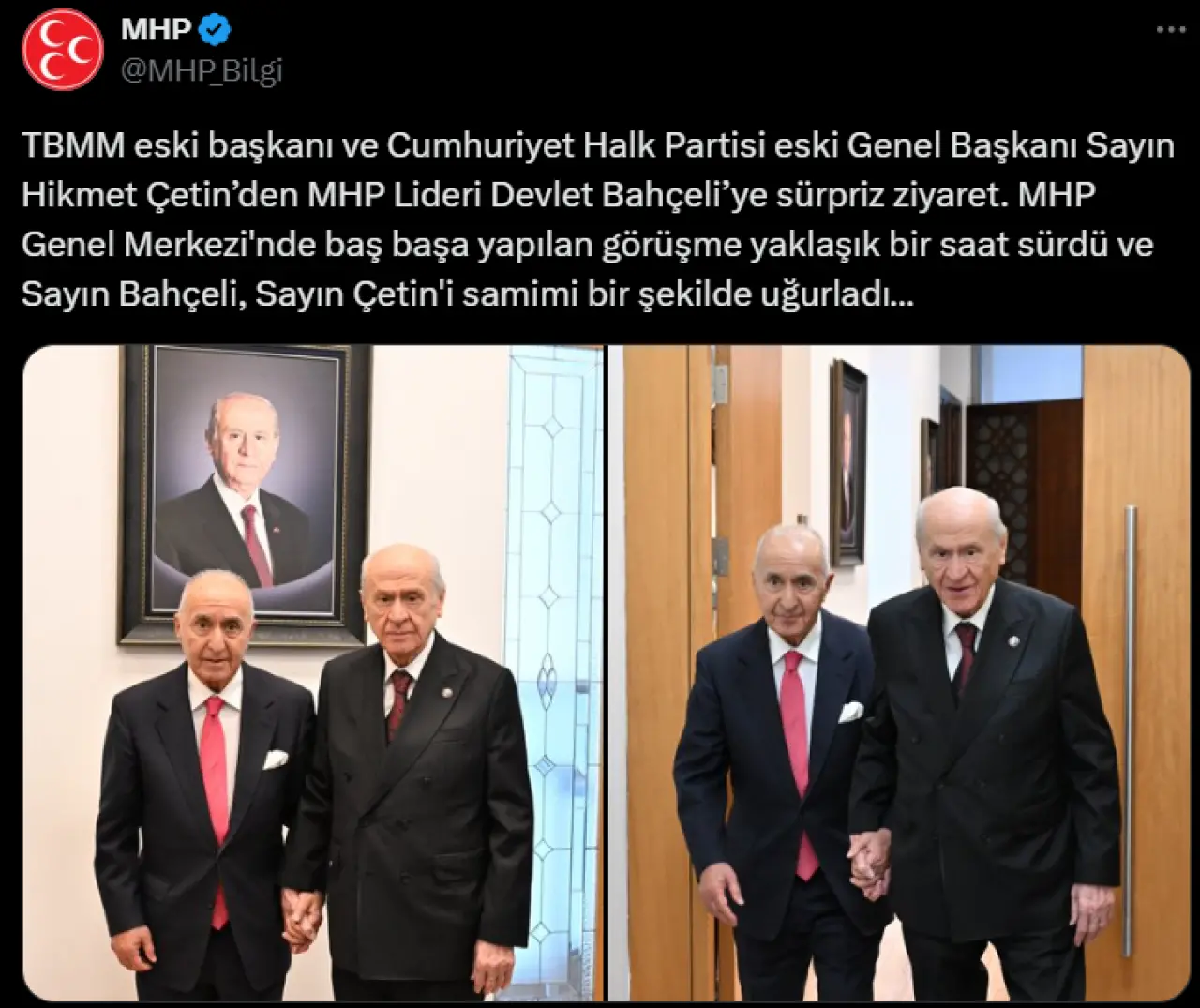 Milliyetçi Hareket Partisi (MHP) sosyal medya hesabı X (eski adıyla Twitter) üzerinden yaptığı açıklamada, TBMM eski Başkanı ve Cumhuriyet Halk Partisi eski Genel Başkanı Hikmet Çetin’in, MHP Lideri Devlet Bahçeli’ye sürpriz ziyaret gerçekleştirdiğini duyurdu.