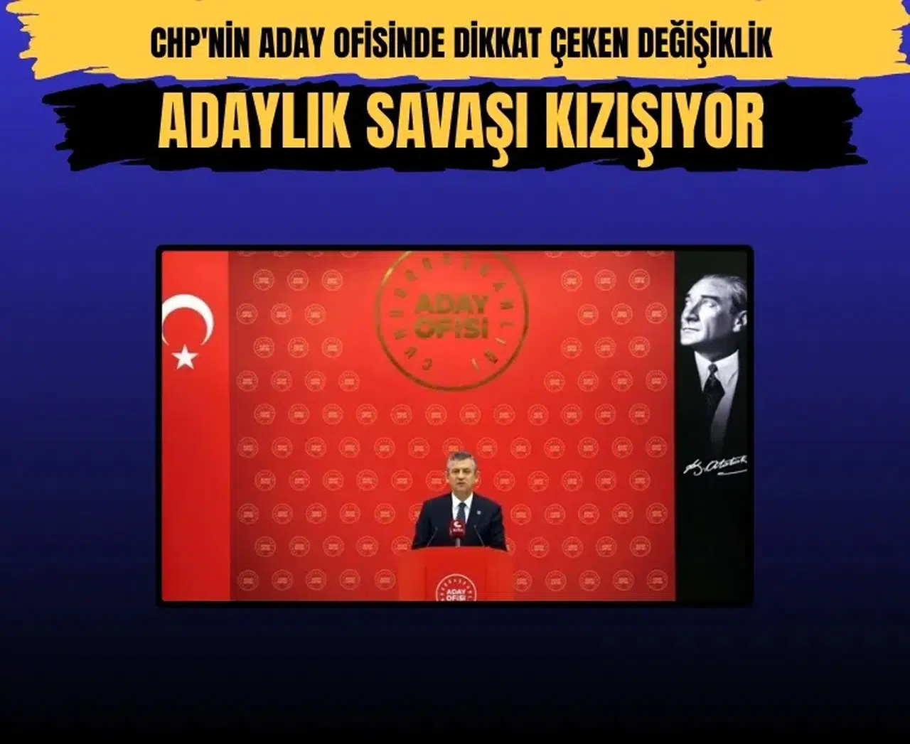 Cumhurbaşkanlığı Aday Ofisi kurulduğunda arka planda yer alan Ekrem İmamoğlu fotoğrafı sessiz sedasız kaldırıldı. Onun yerine sadece “Cumhurbaşkanlığı Aday Ofisi” yazılı sade bir kırmızı fon yer aldı. Bu değişiklik, parti kulislerinde Özgür Özel’in mesaj verdiği şeklinde yorumlandı: “Aday benim”.