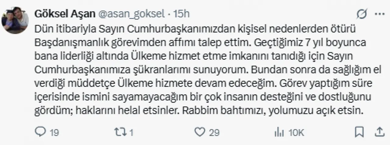“Dün itibarıyla Sayın Cumhurbaşkanımızdan kişisel nedenlerden ötürü Başdanışmanlık görevimden affımı talep ettim. Geçtiğimiz 7 yıl boyunca bana liderliği altında ülkeme hizmet etme imkânını tanıdığı için Sayın Cumhurbaşkanımıza şükranlarımı sunuyorum. Bundan sonra da sağlığım el verdiği müddetçe ülkeme hizmete devam edeceğim.”