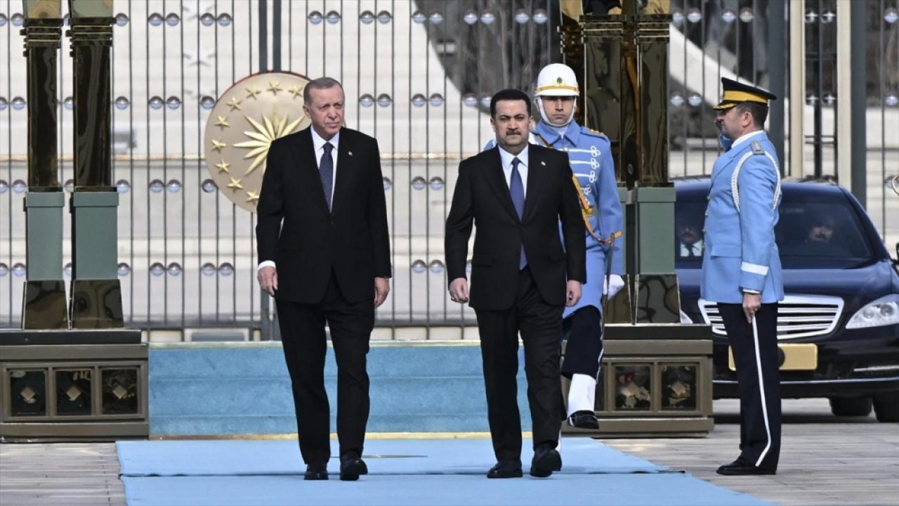 Erdoğan ve Şiya es-Sudani'nin tören alanındaki yerlerini almasının ardından, 21 pare top atışı eşliğinde iki ülke milli marşları çalındı.