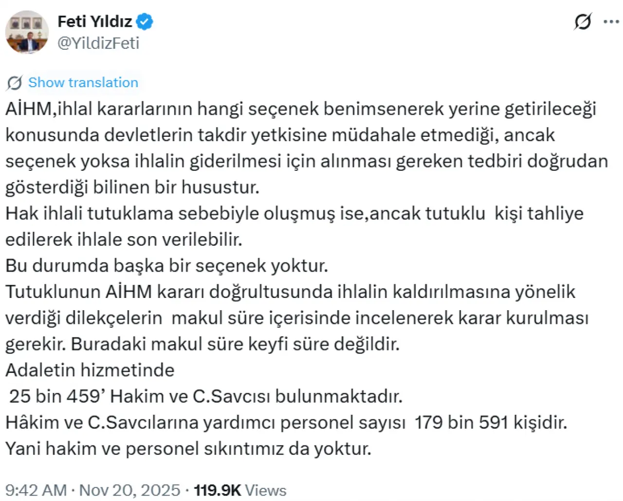 Yıldız, devletin hukuk çerçevesinde hareket ettiğini belirterek, AİHM kararlarının uygulanmasında Türkiye’nin takdir yetkisine sahip olduğunu, ancak ihlalin doğrudan tutuklama kaynaklı olması durumunda çözümün açık olduğunu dile getirdi.