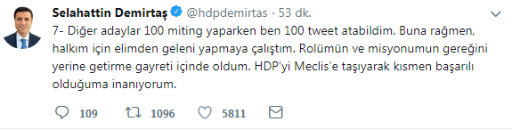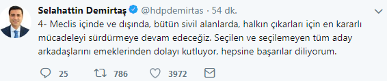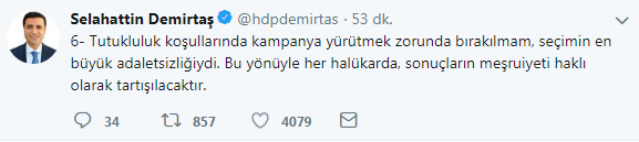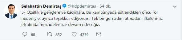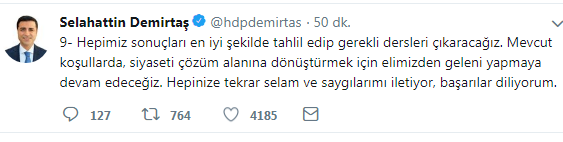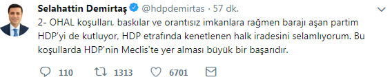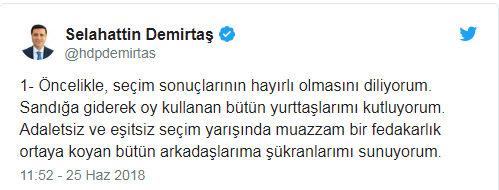 Demirtaş, "Öncelikle, seçim sonuçlarının hayırlı olmasını diliyorum. Sandığa giderek oy kullanan bütün yurttaşlarımı kutluyorum. Adaletsiz ve eşitsiz seçim yarışında muazzam bir fedakarlık ortaya koyan bütün arkadaşlarıma şükranlarımı sunuyorum." dedi.