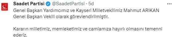 Saadet Partisi sosyal medya hesabından yapılan açıklamada, "Genel Başkan Yardımcımız ve Kayseri Milletvekilimiz Mahmut Arıkan Genel Başkan Vekili olarak görevlendirilmiştir. Kararın milletimiz, memleketimiz ve camiamız için hayırlı olmasını temenni ederiz" denildi.