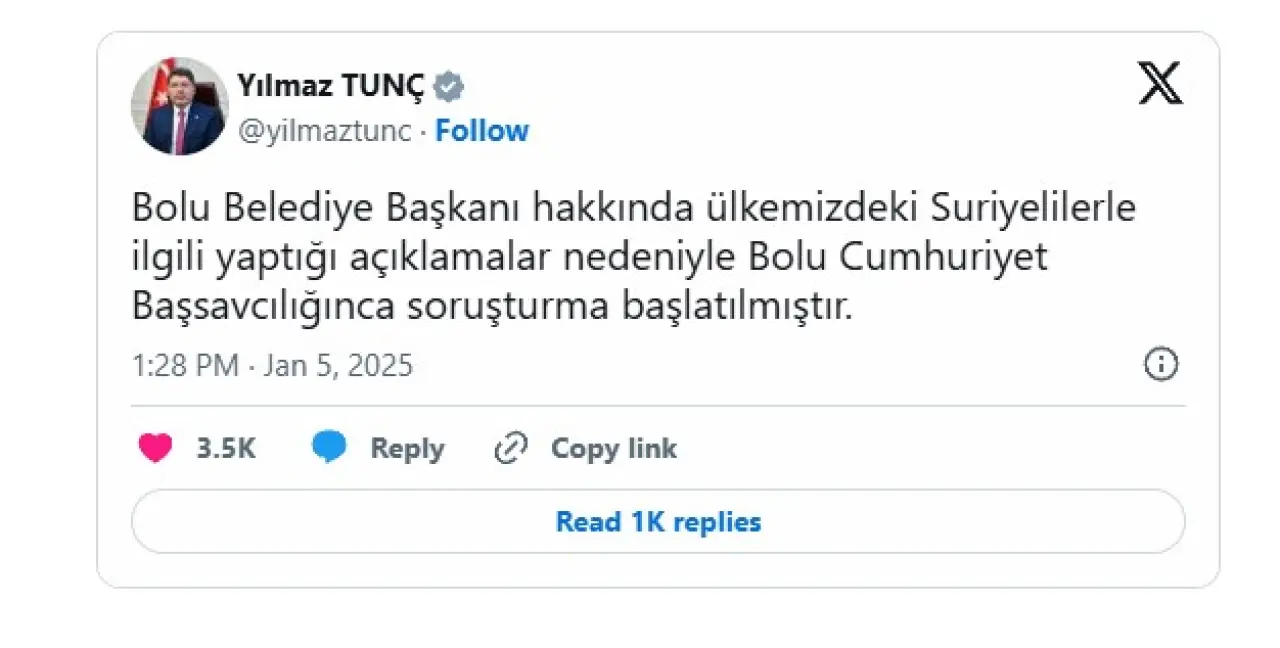 Özcan’ın açıklamaları, kısa süre içinde büyük bir tartışma yarattı. Adalet Bakanı Yılmaz Tunç, Twitter (X) hesabı üzerinden yaptığı duyuruda, Bolu Cumhuriyet Başsavcılığı'nın Özcan hakkında soruşturma başlattığını açıkladı. Bakan Tunç, "Bolu Belediye Başkanı hakkında, ülkemizdeki Suriyelilerle ilgili yaptığı açıklamalar nedeniyle Bolu Cumhuriyet Başsavcılığınca soruşturma başlatılmıştır" diyerek sürecin takip edileceğini belirtti.