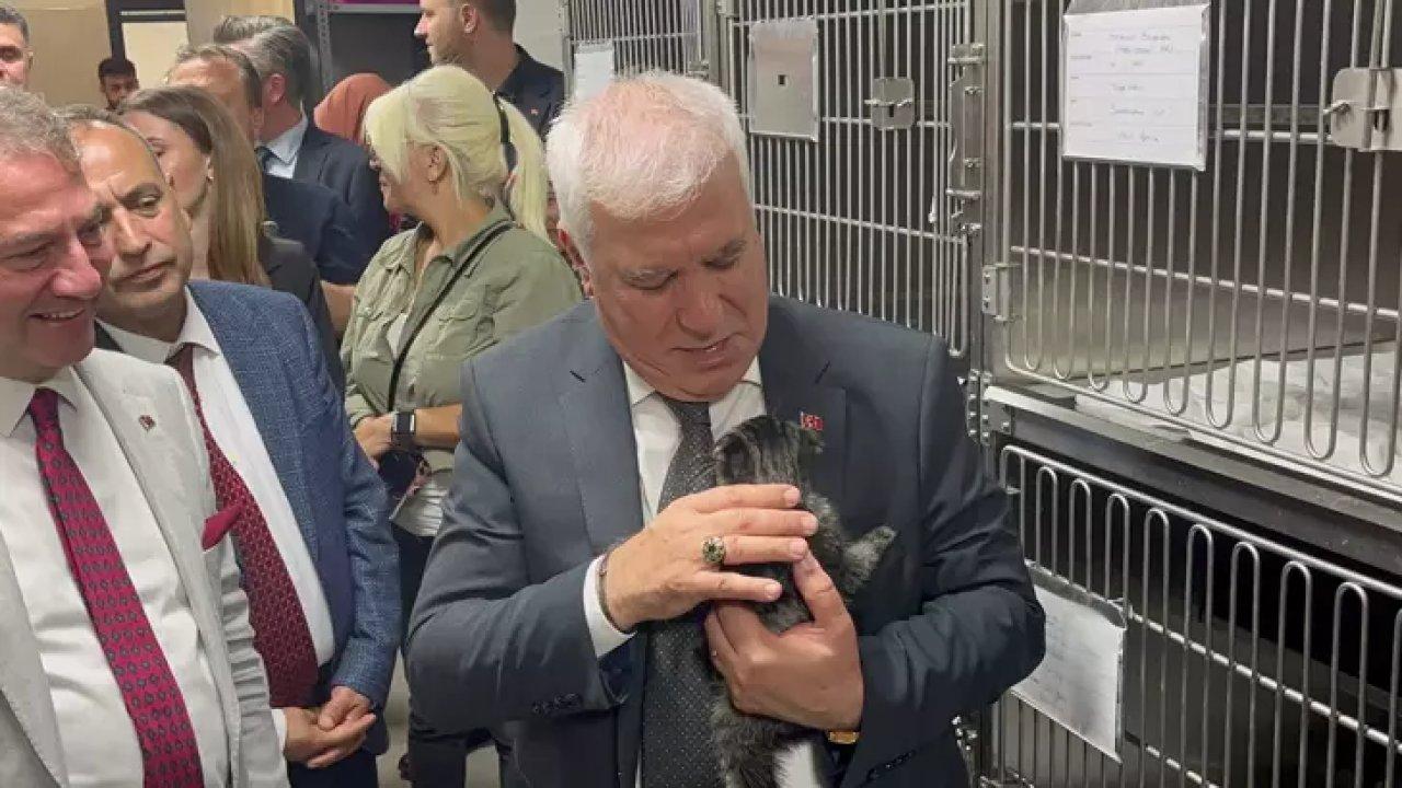 Bozbey, toplantının ardından barınaktaki yavru bir kediyi sahiplendi.
