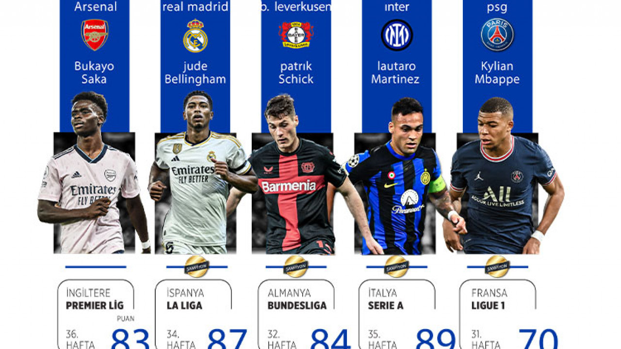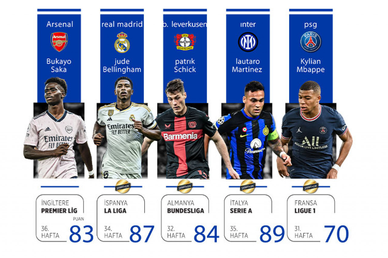 İspanya'da Real Madrid, Almanya'da Bayer Leverkusen, İtalya'da Inter, Fransa'da ise Paris Saint-Germain (PSG) şampiyonluğu garantilerken, İngiltere'de Arsenal, puan tablosunun zirvesinde yer aldı.