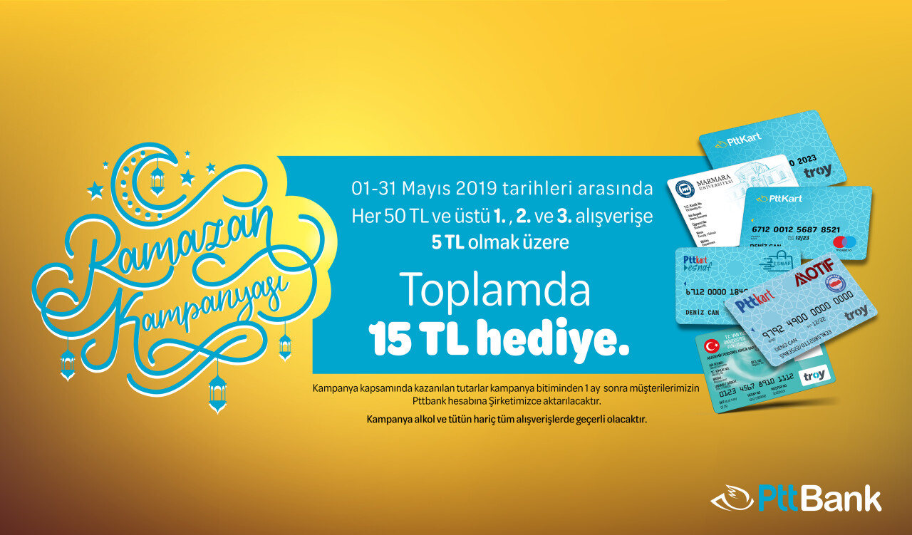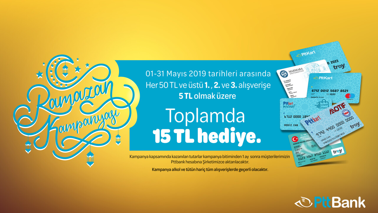 Türkiye'nin en önemli taşımacılık ve bankacılık kuruluşları arasında yer alan Posta ve Telgraf Teşkilatı Anonim Şirketi (PTT AŞ),Ramazan ayı boyunca yaptığı kampanyalarla da vatandaşın yüzünü güldürecek. PTT Kart kullanıcıları "Ramazan Ayı Kampanyası" doğrultusunda 1-31 Mayıs tarihleri arasında 50 TL ve üstü yapacakları harcamalarda toplamda 15 TL hediye kazanacak. Kazanılan tutarlar kampanya bitiminden bir ay sonra vatandaşların PTTBank hesabına aktarılacak. Kampanya alkol ve tütün ürünleri hariç tüm alışverişlerde geçerli olacak.