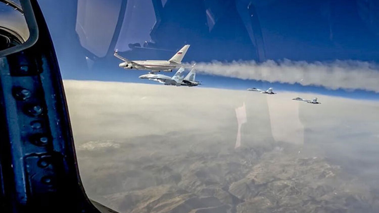 Rusya Savunma Bakanlığının yayınladığı videoya göre, Putin’in içerisinde bulunduğu İL-96 model devlet başkanlığı uçağına eşlik etmek üzere savaş uçakları da kalkış yaptı.