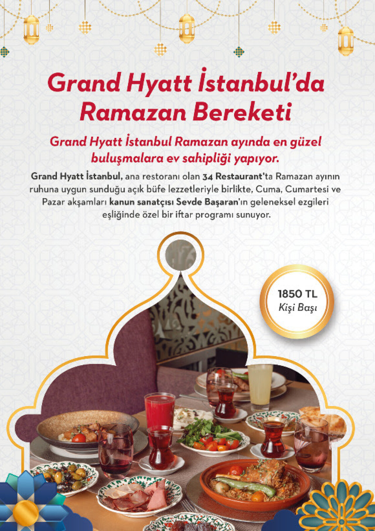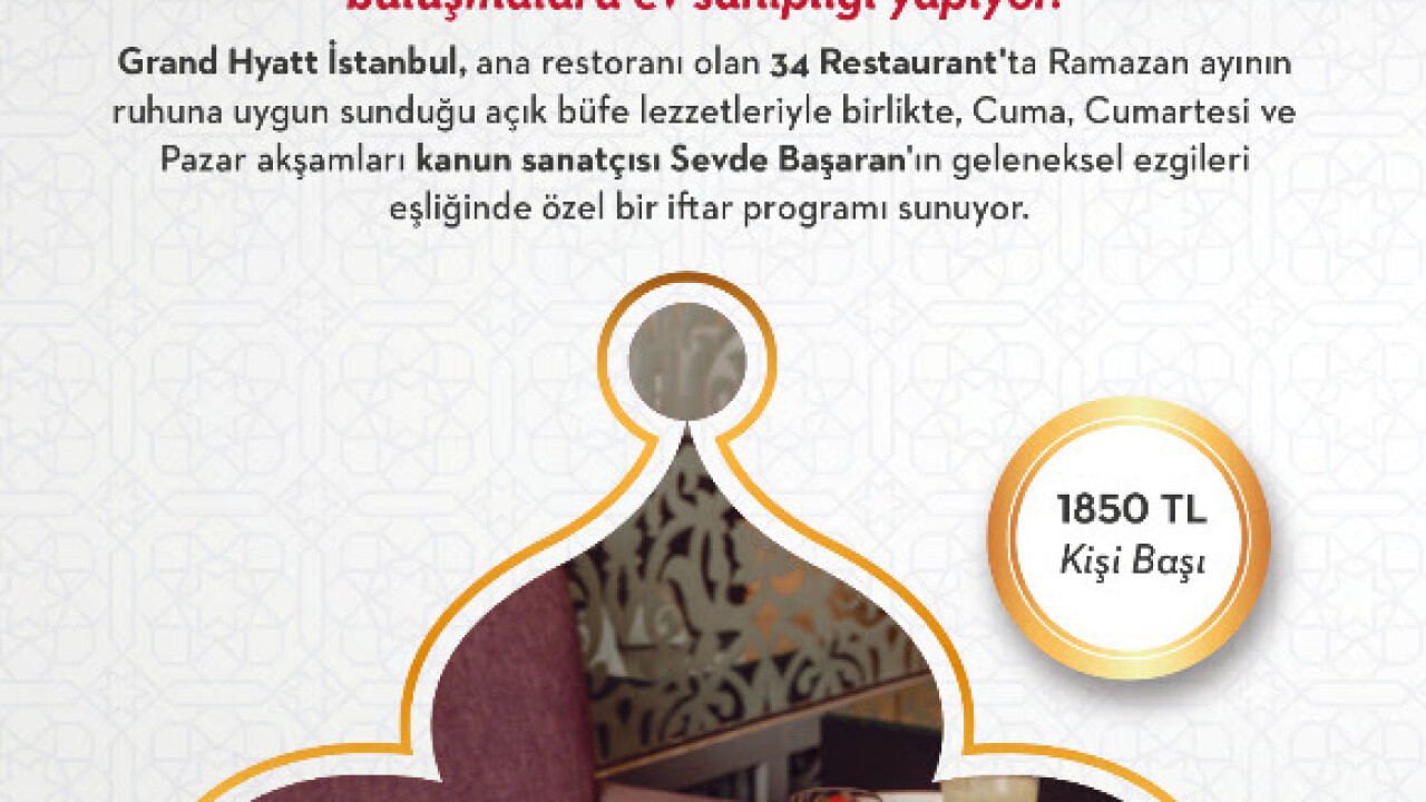 Ramazan ayının en özel anlarını sevdiklerinizle birlikte Grand Hyatt Istanbul'un muhteşem atmosferinde geçirebilirsiniz. Cuma, cumrtesi ve pazar akşamları Sevde Başaran'ın benzersiz kanun performansı eşliğinde Osmanlı macunundan şerbete, iftariyeliklerden güllaça ramazanın tüm tatlarını Grand Hyatt Istanbul iftar menüsü ile tadımlayın.