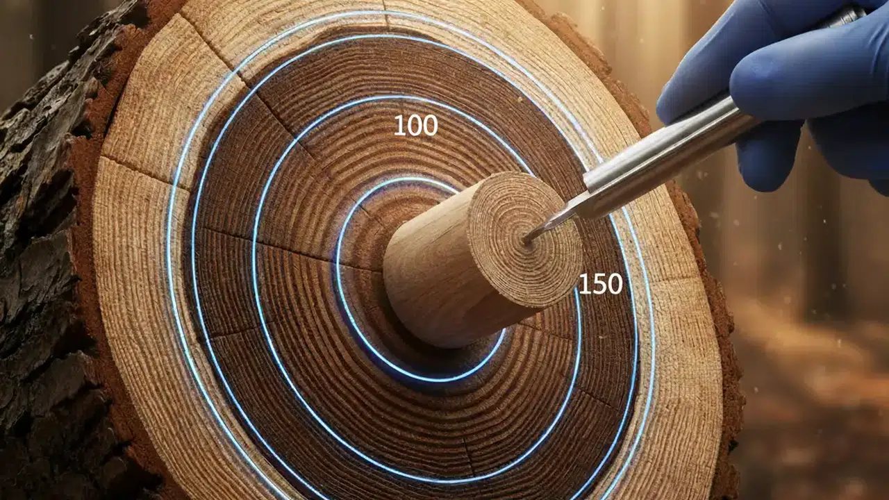 • Halkaların Sayılması: Ağaç kesildiyse, kütük yüzeyindeki halkalar doğrudan sayılır. Kesilmemiş ağaçlar için ise, artım burgusu (increment borer) adı verilen özel bir aletle ağacın merkezine kadar uzanan ince bir silindir şeklinde odun özü örneği (core sample) alınır.