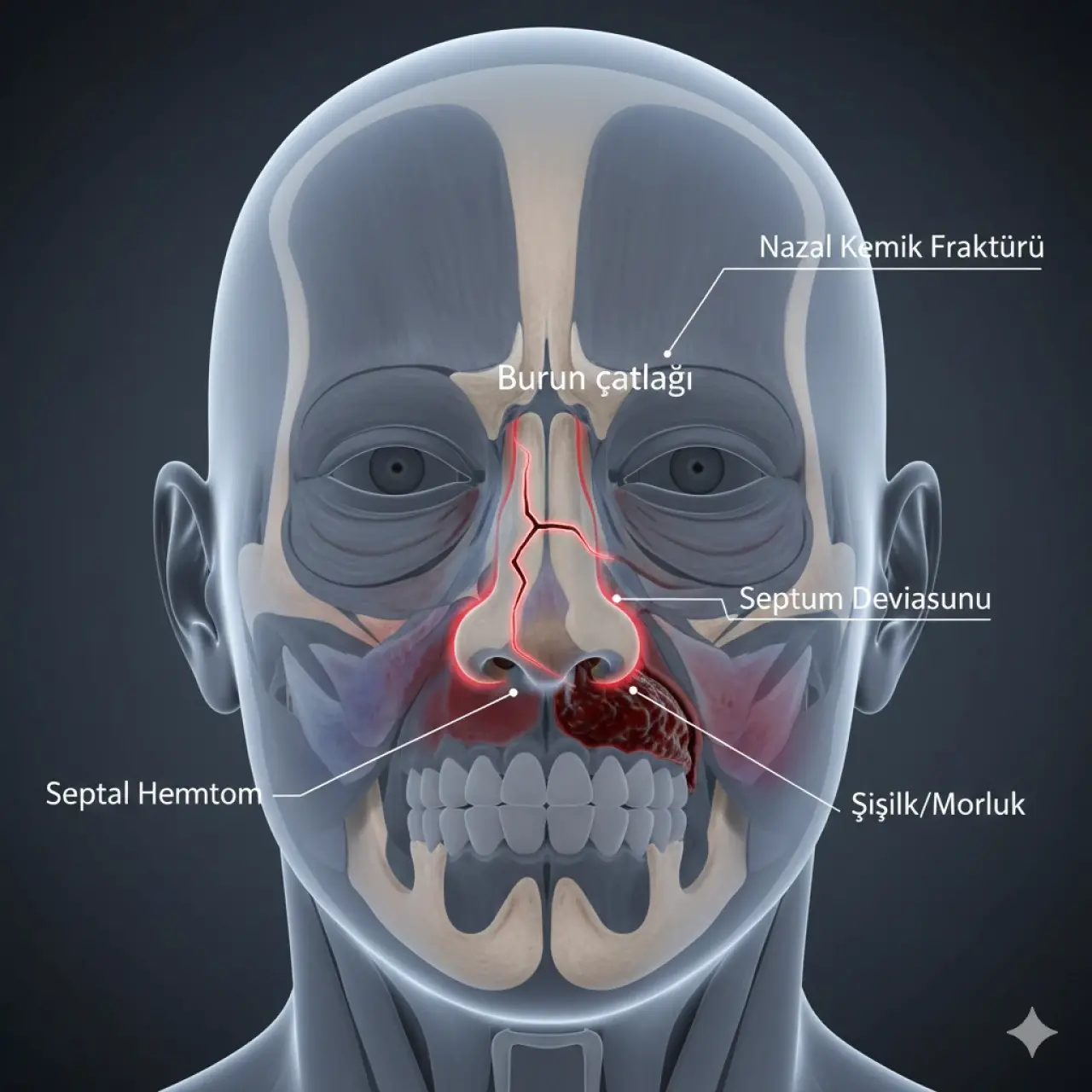 - Şekil Bozukluğu ve Deformite: Burun kemiğinin yerinden oynaması sonucu burnun yan yatması, basıklaşması veya eğrilmesi gibi görsel değişikliklerin oluşmasıdır.