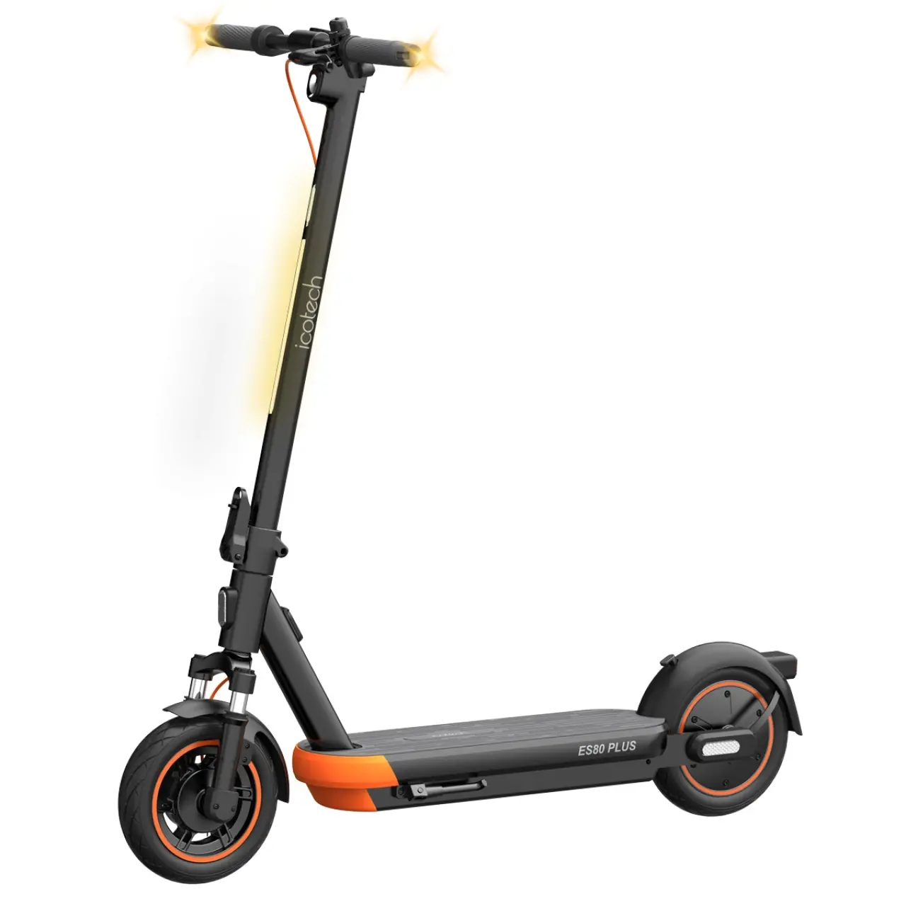 Icotech ES80 Plus, şehir içi ulaşımı pratik hale getiren uzun menzil odaklı bir elektrikli scooter. 48 V 13 Ah batarya ve 900 W tepe güç kombinasyonu günlük rota ve ara durakları rahatlıkla çıkarırken 25 km/saatlik hız sınırı güvenli ve yasal kullanıma uygun bir performans sunar. 10 inç pnömatik lastikler ve ön süspansiyon, bozuk zeminlerde titreşimi azaltır. Sinyal, LED far ve fren lambası görünürlüğü artırır. Hız sabitleyici ve KERS gibi özellikler de sürüş konforunu destekler.