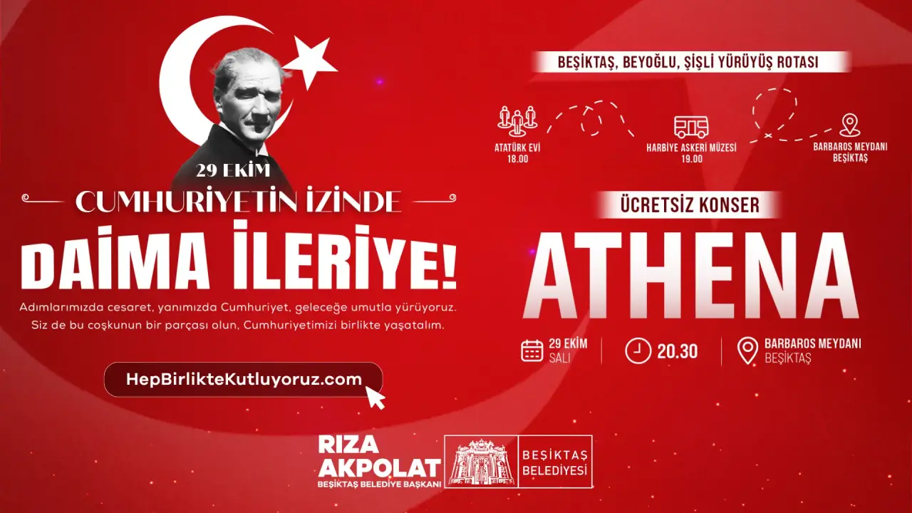 Beşiktaş Belediye tarafından 29 Ekim Cumhuriyet Bayramı kapsamında ATHENA grubu Barbaros Meydanı'nda düzenlenen konser ile sahne alacak.