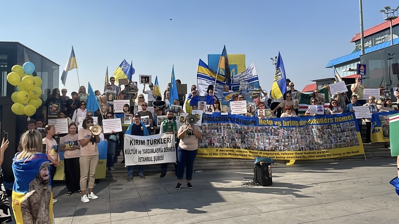 Beyoğlu Odakule Meydanı'nda bir araya gelen İstanbul'da yaşayan Ukraynalılar, Rusya aleyhine pankart açtı.