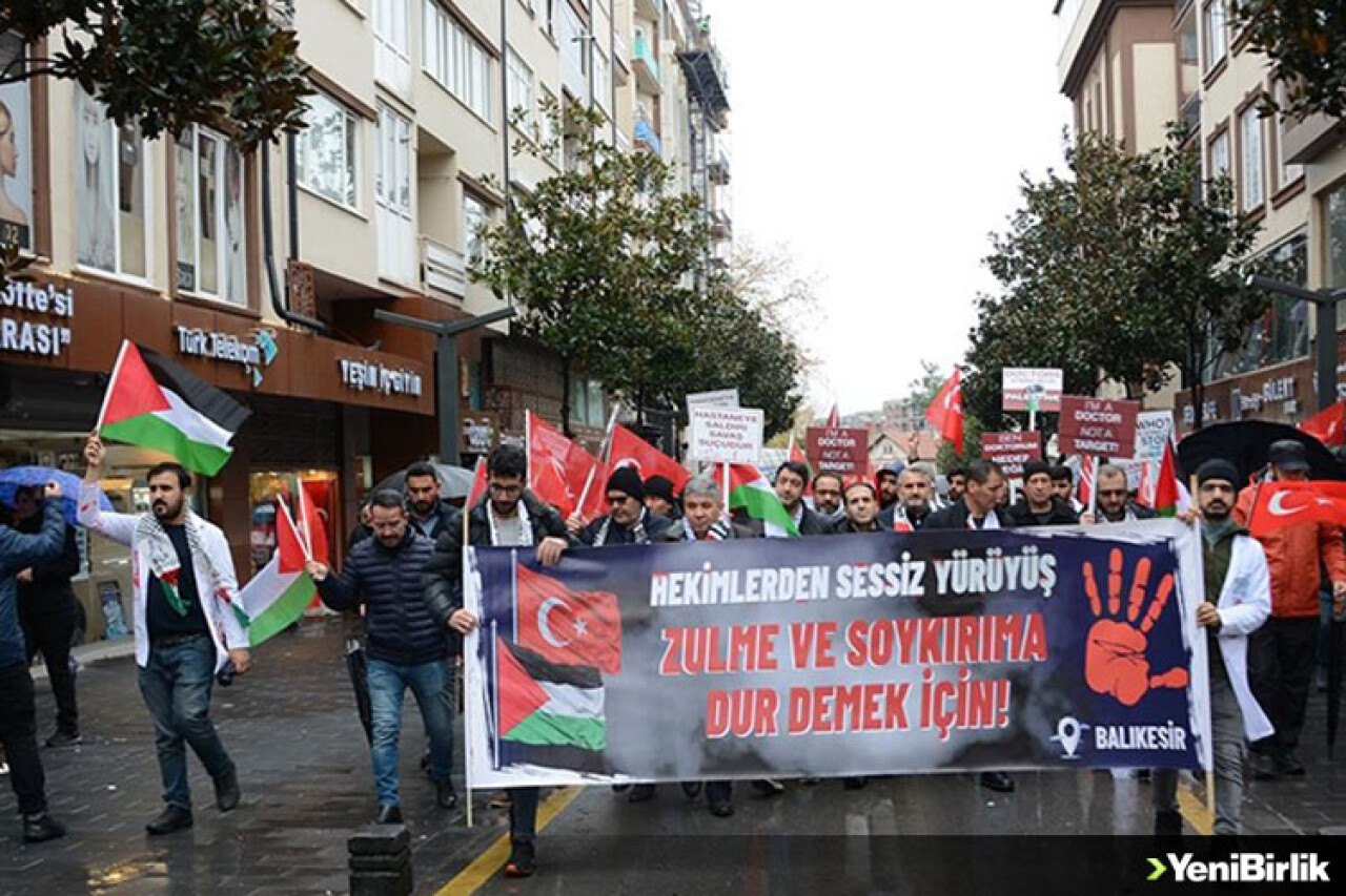 Beyaz önlük giyen, ellerinde Türk ve Filistin bayrakları bulunan hekimler "sessiz" gerçekleştirdikleri yürüyüşle İsrail'i protesto etti.