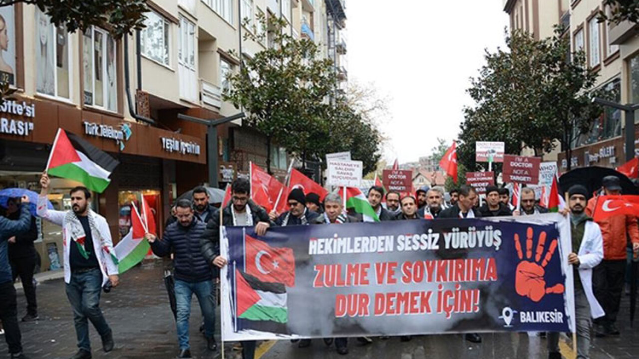 Türk ve Filistin bayrakları ile "Beyaz önlüklerimiz kana bulanmasın", "Hastaneye saldırı savaş suçudur" yazılı dövizler taşıyan grup, Cumhuriyet Caddesi'nden 15 Temmuz Demokrasi Meydanı'na kadar "Hekimlerden Sessiz Yürüyüş" gerçekleştirdi.