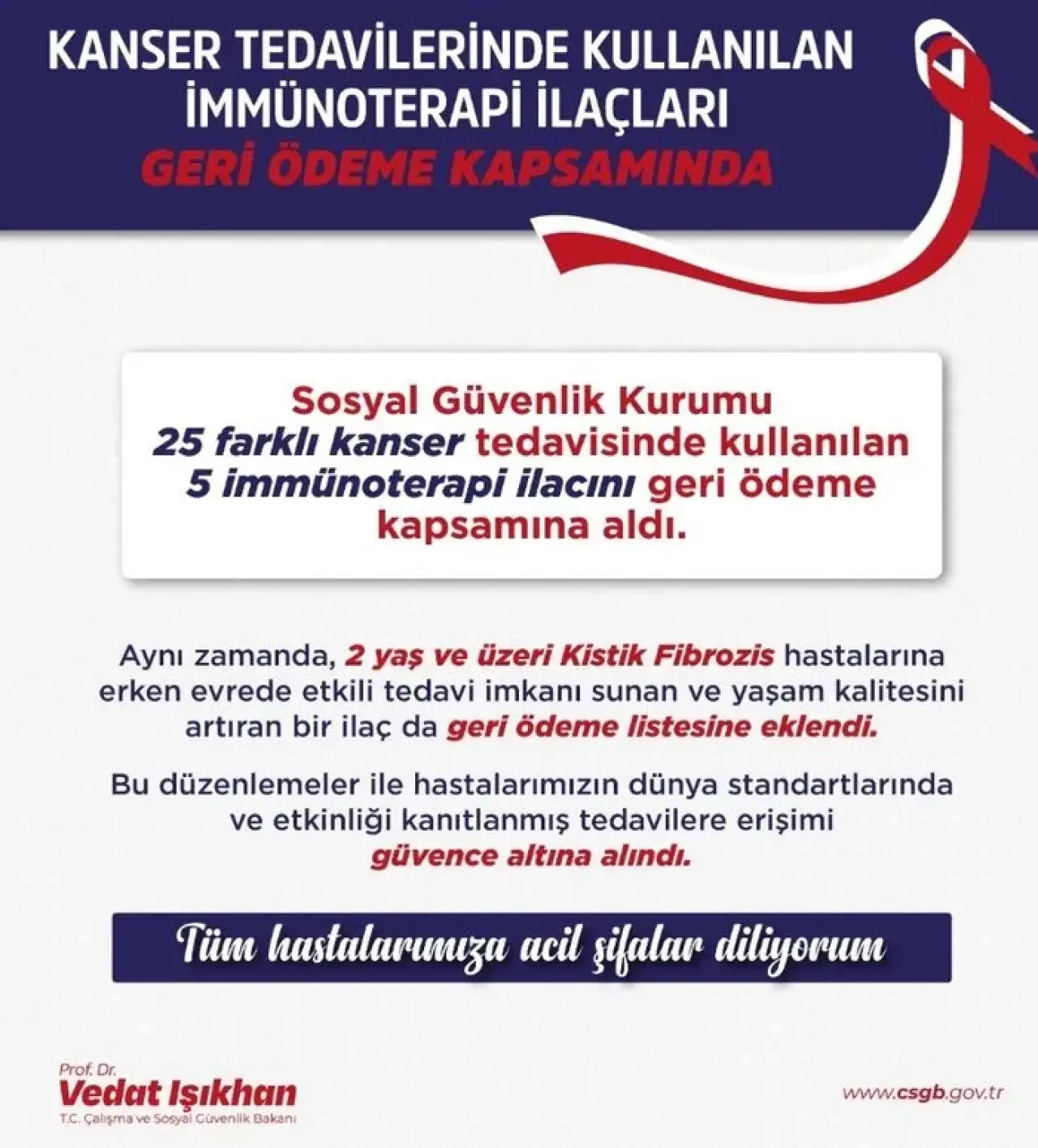 “Kanserle savaşan vatandaşlarımızın her zaman yanındayız. 5 yeni immünoterapi ilacının SGK geri ödeme kapsamına alınmasıyla tedaviye erişimi artırmayı hedefliyoruz. İlaçların şifa olması en büyük temennimiz.”