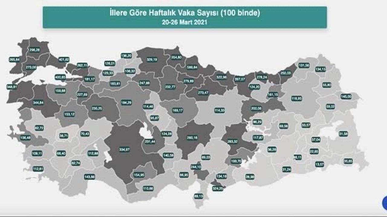 Sağlık Bakanlığı tarafından güncellenen Türkiye 81 ilin vaka sayısı haritasına göre 19-26 Mart tarihinde en çok vaka Samsun, İstanbul ve Yalova'da görüldü.