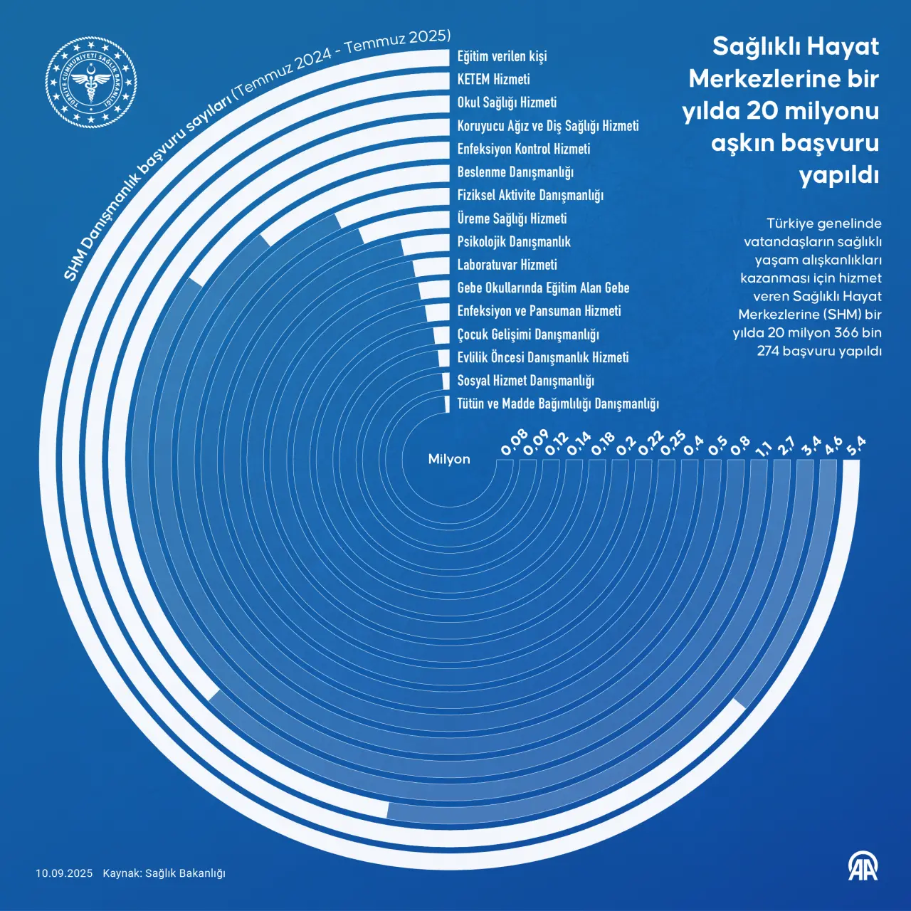 Türkiye genelinde vatandaşların sağlıklı yaşam alışkanlıkları kazanması için hizmet veren Sağlıklı Hayat Merkezlerine (SHM) bir yılda 20 milyon 366 bin 274 başvuru yapıldı