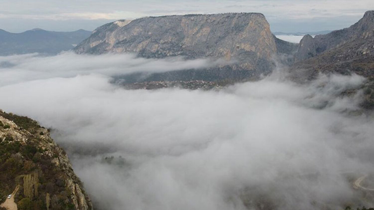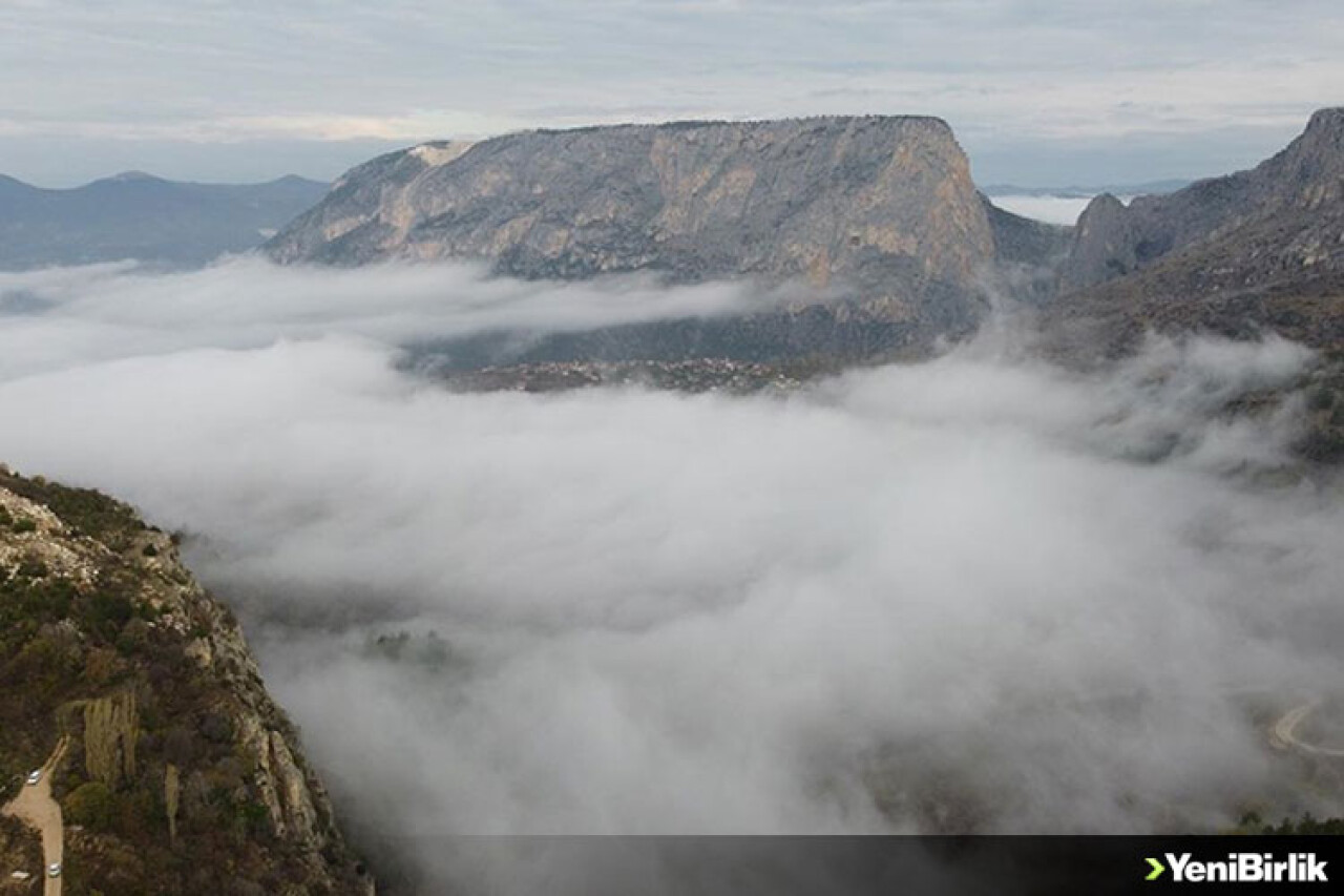 Nehir ve çevresindeki yerleşim bölgelerini, seraların üzerini kaplayan sis bulutunu AA ekibi dronla kaydetti.