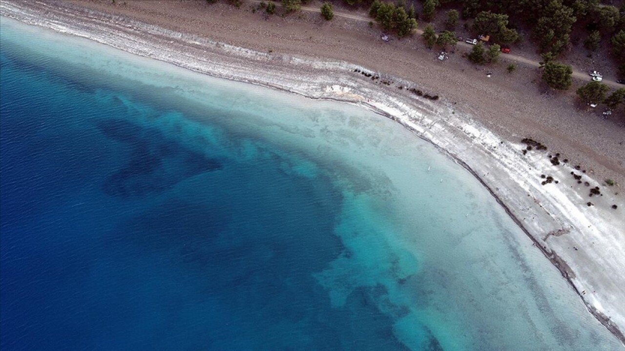 Doğanbaba plajında kıyaya yakın bölgede turkuaz suda beliren ve AA ekibince havadan görüntülenen kalp şekli, görenleri hayran bıraktı.