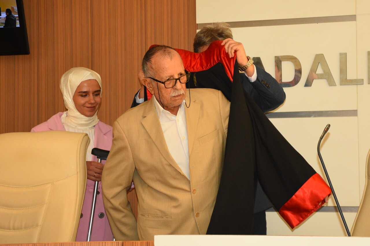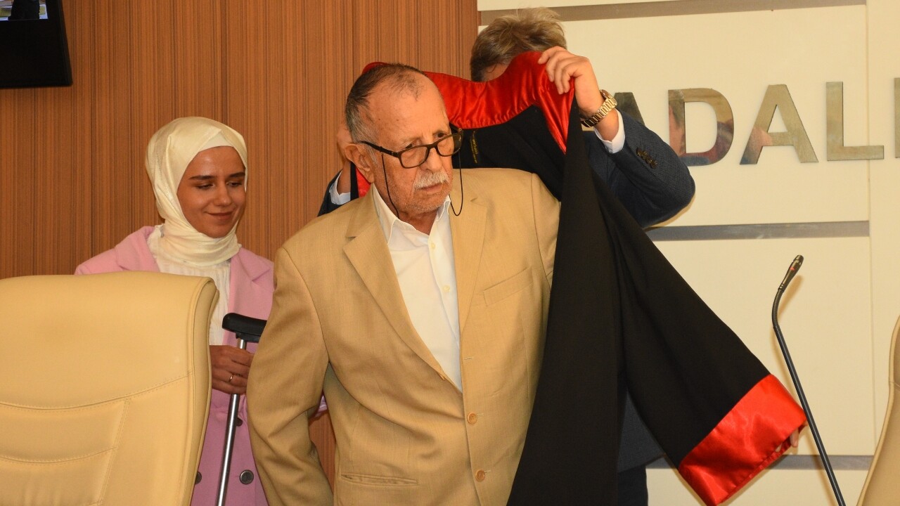 Proje ortaklarından Samsun Adliyesine getirilen Çelenk'e, hakim cübbesi giydirildi.