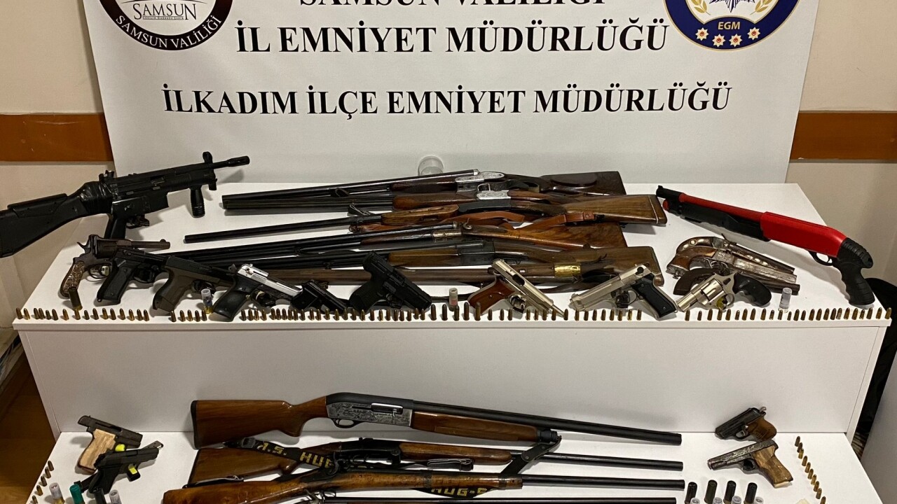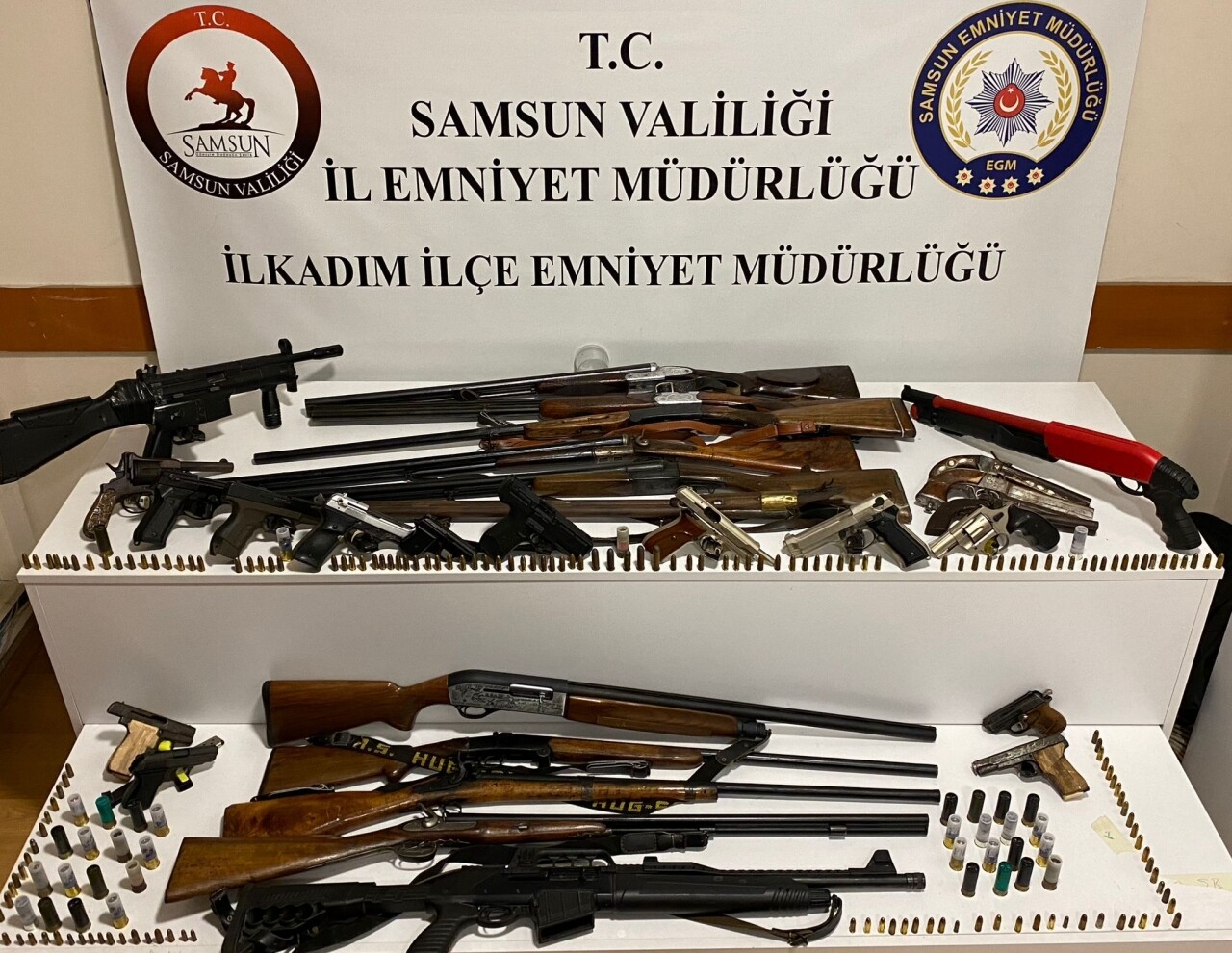 Adreslerde arama yapan ekipler, 4 ruhsatsız tabanca, 3 antika tabanca, 12 ruhsatsız tüfek, 8 kurusıkı tabanca, 159 tabanca fişeği ve 52 tüfek kartuşu ele geçirdi.
