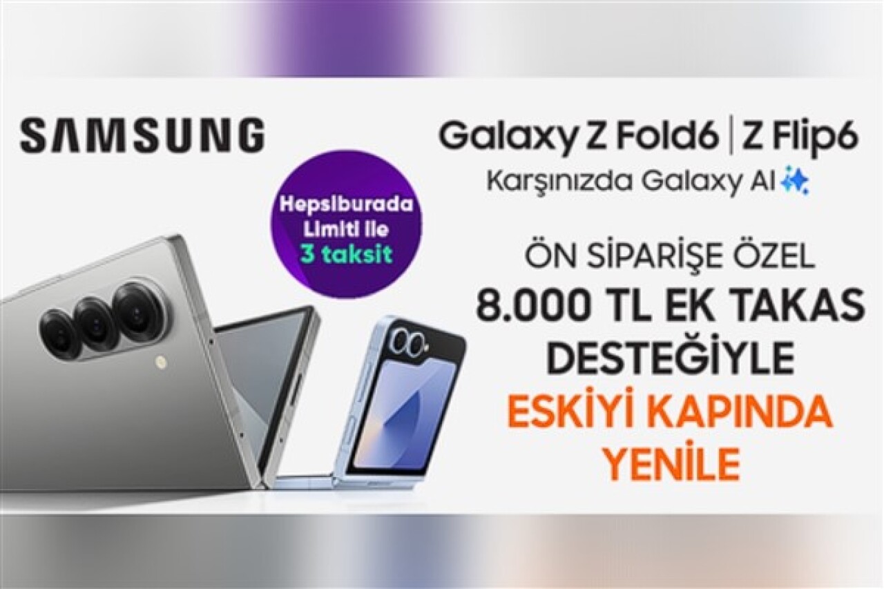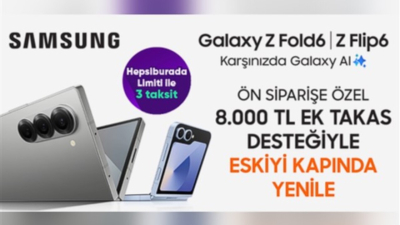 Samsungun yenilikçi katlanabilir telefonları Galaxy Z Fold6 ve Galaxy Flip6, özel avantajlarla Hepsiburadada satışa sunuldu. Kampanya kapsamında 8 bin TLye varan ek takas desteği, Hepsiburada Limiti ile 3 taksitle ödeme fırsatı ve Galaxy Z Fold6 Kalemli Kılıf veya Galaxy Z Flip6 Yüzüklü Kılıf hediyesi de dikkat çekiyor.