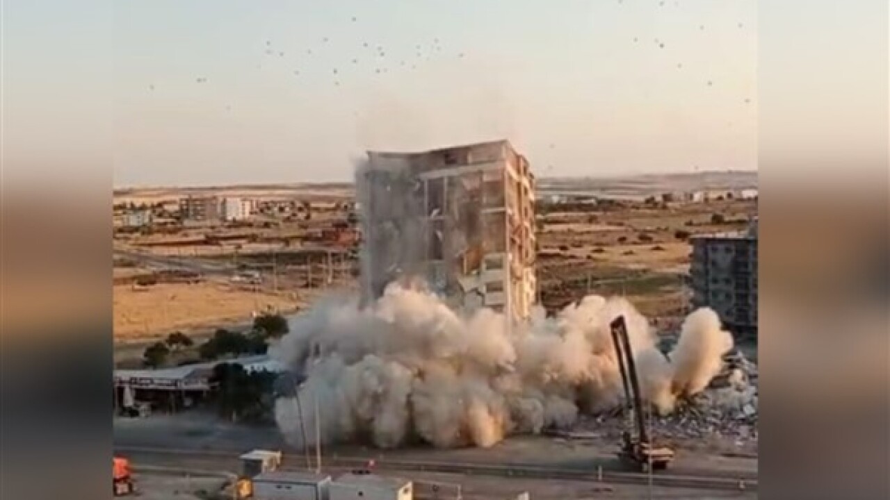 Şanlıurfa'nın Siverek ilçesinde, 6 Şubat 2023 tarihinde meydana gelen depremde ağır hasar gören 17 katlı binanın ekiplerin kontrollü çalışması ile yıkımı yapıldı.