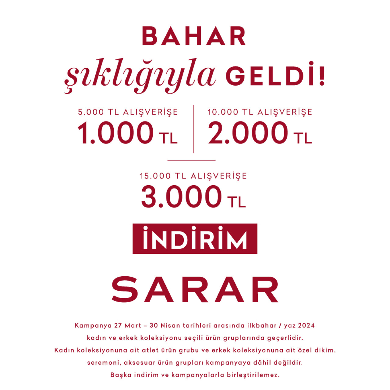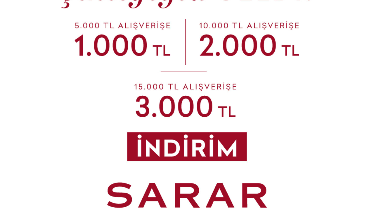 80 yıldır şıklığın izini nesillerden nesillere aktaran Sarar, Nisan ayını özel bir indirimle karşılıyor. 30 Nisan tarihine kadar; Sarar mağazalarında ve sarar.com’da yapılacak alışverişlerde, her 5.000 TL’lik alışverişe, 1.000 TL, her 10.000 TL’lik alışverişe 2.000 TL ve her 15.000 TL’lik alışverişe de 3.000 TL’lik bir indirim sağlanacak.