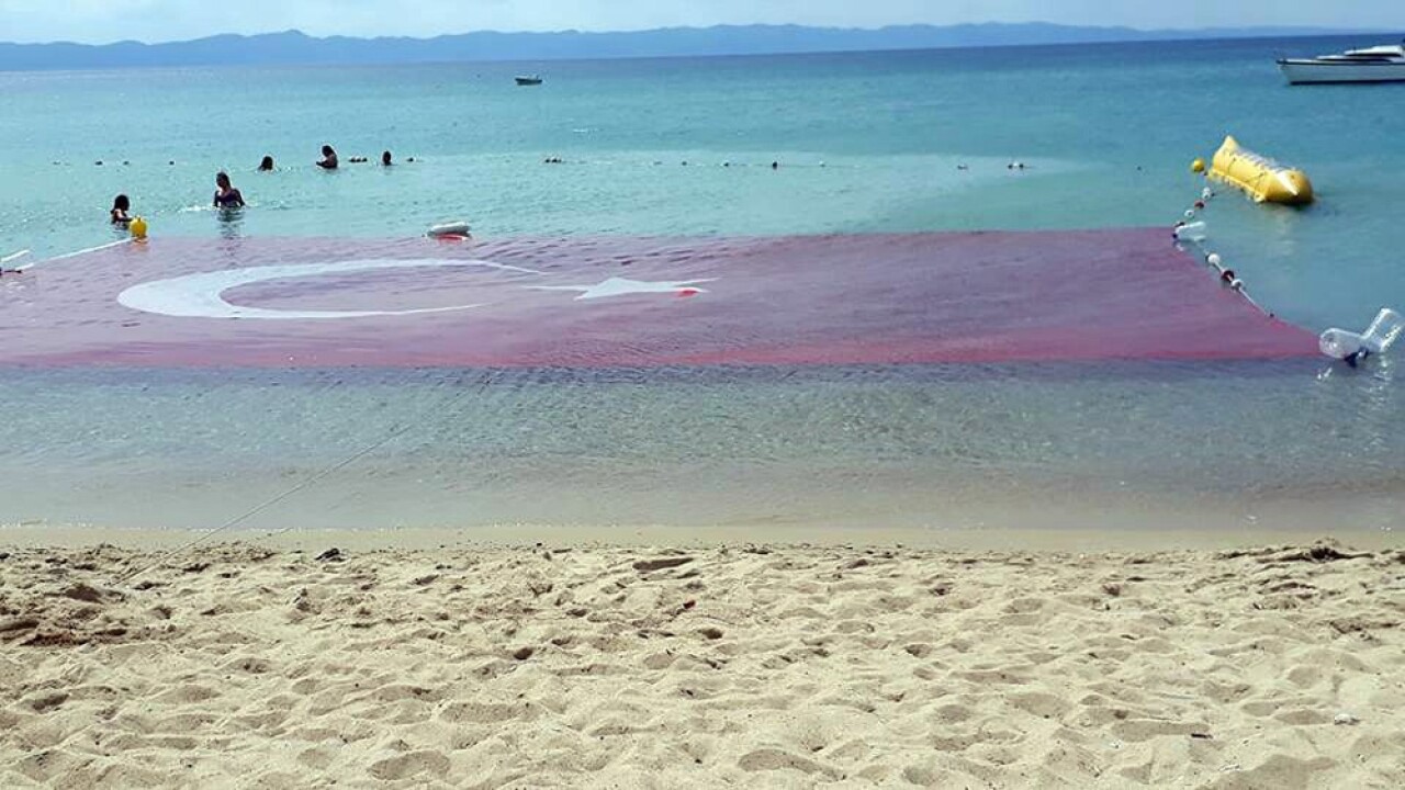Edirne’nin Keşan ilçesine bağlı Erikli sahilinde bir işletmeci tarafından 30 Ağustos Zafer Bayramı nedeniyle denize dev Türk bayrağı açıldı.