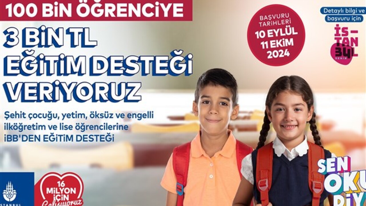 Yaklaşık 100 bin öğrenciye verilecek 3 bin TL'lik “Sen Oku Diye” eğitim desteği için, öğrenciler 11 Ekim 2024 tarihine kadar “İstanbul Senin Uygulaması” ya da https://senokudiye.ibb.istanbul/ portalı üzerinden başvuruda bulunacak.