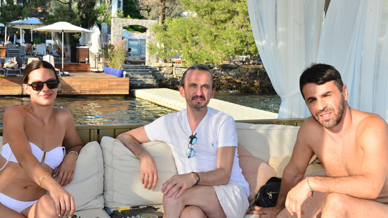 Sakarya Spor teknik direktörü Tuncay Şanlı, dostları Mesut Kumcuoğlu ve tescilli güzellerden Dilara Korkmaz ile birlikte Serafina Mare de güneşleniyorlardı.