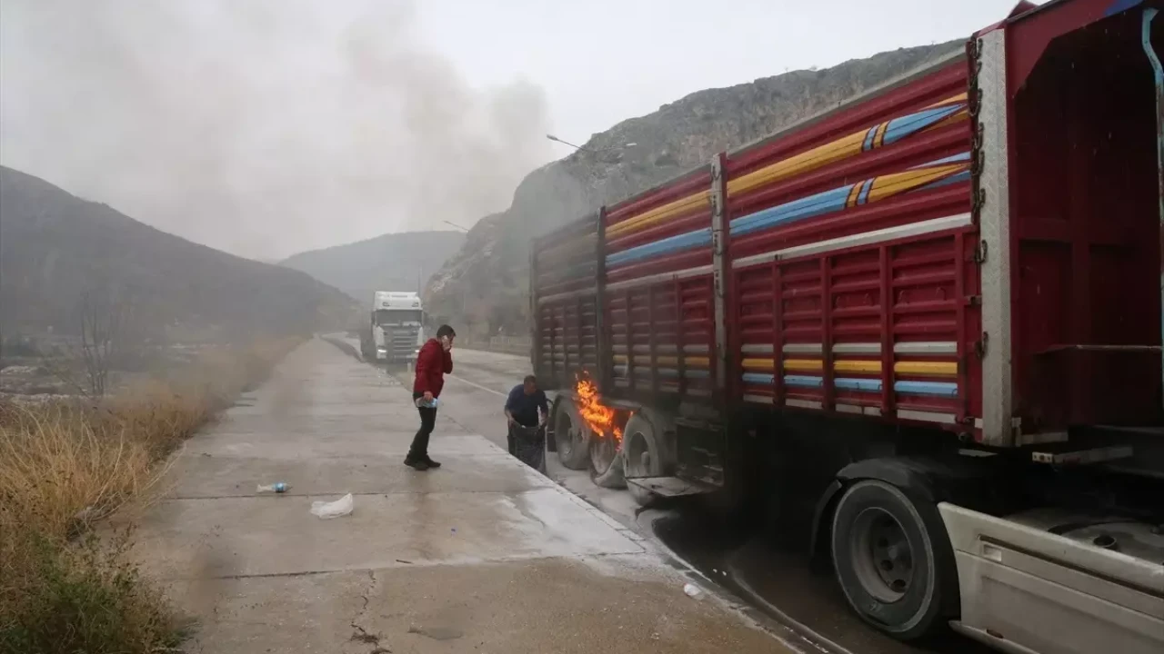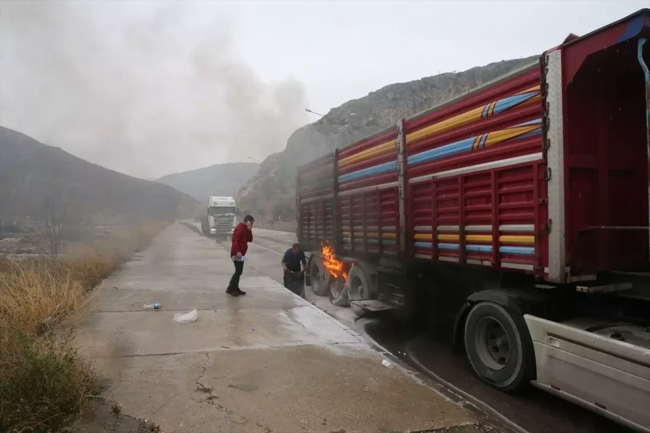 Bedestenlioğlu Mahallesi Çevre Yolu'nda, Hacı Akça idaresindeki 05 HA 939 plakalı tırın dorse kısmının lastiği alev aldı.