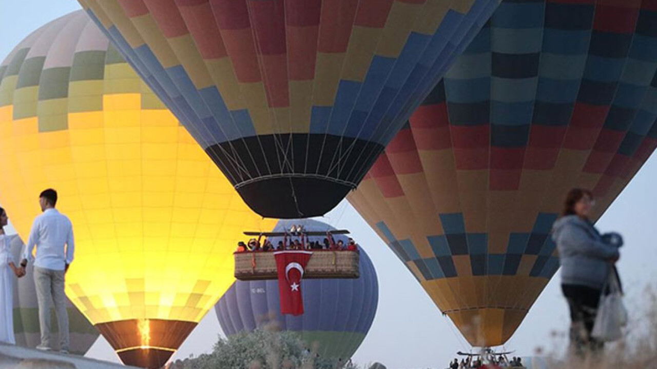Sıcak hava balonları Kapadokya semalarında Türk bayraklarıyla süzüldü