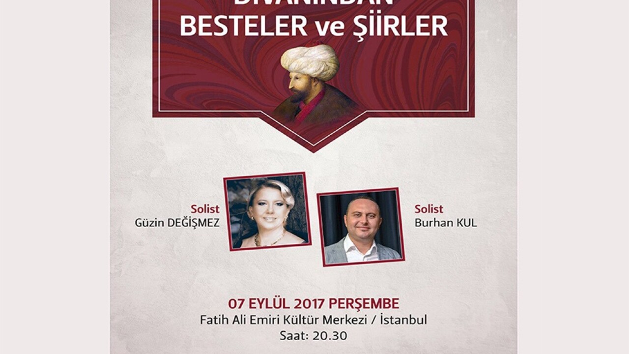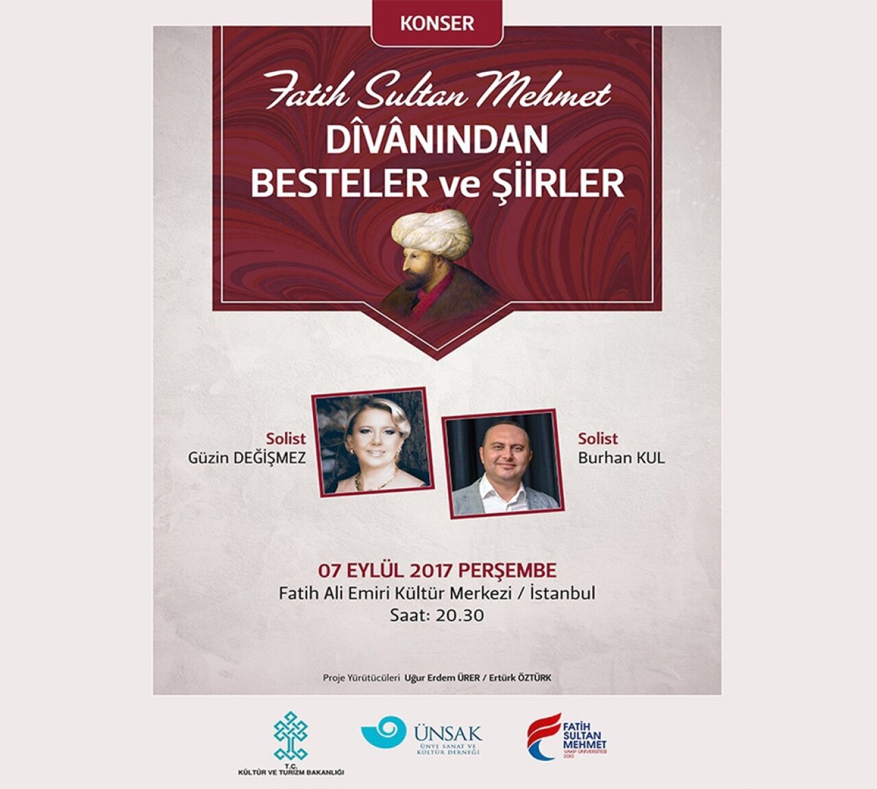 Kültür ve Turizm Bakanlığının himayelerinde Telif Hakları Genel Müdürlüğü’nün desteğiyle hazırlanan “Fatih Sultan Mehmet Dîvânından Besteler ve Şiirler” projesi, müzik ve şiir albümü ile kitap olarak tasarlandı. Peygamber müjdesine mazhar olmuş, devlet adamı vasfının yanında felsefe, musıkî, resim ve şiir gibi pek çok alana ilgi duymuş, çok yönlü bir şahsiyet olan Fatih Sultan Mehmet’in kaleme aldığı şiirler günümüz Türkçesiyle düz yazıya da çevrilerek, Türkçe, Boşnakça ve İngilizce kitap olarak yayınlandı. Proje koordinatörlüğünü Uğur Erdem Ürer’in yürüttüğü, sanat yönetmenliği ve solistliğini Burhan Kul’un üstlendiği, Güzin Değişmez’in solist olarak yer aldığı proje; ülkemizin önemli bestekâr ve saz sanatçılarını bir araya getirdi. Alâeddin Yavaşca, Tevfik Soyata, Şentürk Deveci ve Zeki Atkoşar’ın yanında Derya Türkan, Muhammed Ceylan ve Sercan Erenler de beste ve enstrümanlarıyla projede yer aldı.