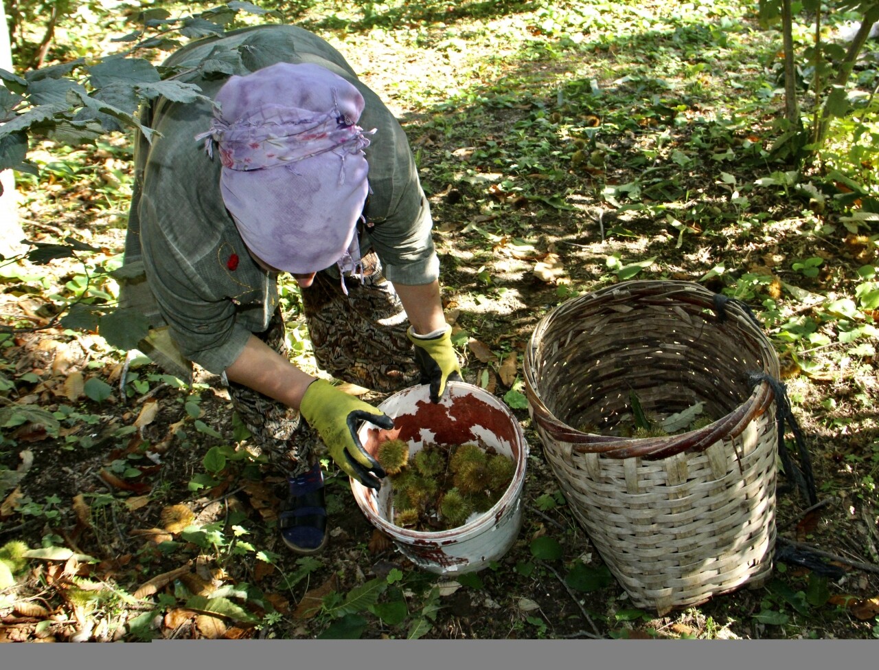 Ağaçtan yere dökülen kozalakları önce kovalara toplayan, ardından sepetlere koyarak araçlara yükleyen üreticiler, evlerinin bahçesinde kestaneleri kozalaklarından ayırarak satışa hazır hale getiriyor.