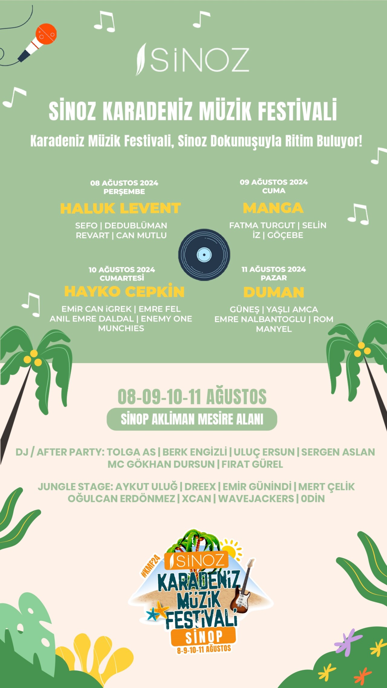 Deniz kenarında müziğin ve dansın tadını çıkararak unutulmaz anılar biriktirmek isteyen herkesi Sinoz Karadeniz Müzik Festivali’ne davet ediyoruz. Sinop Akliman’ın eşsiz manzarasında müziğin ritmiyle dans edecek, yeni insanlarla tanışacak ve unutulmaz bir deneyim yaşayacaksınız.