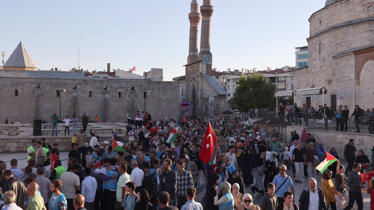 Sivas Tren Garı önünde Türk ve Filistin bayrakları ile dövizler taşıyan grup, slogan, salavat ve tekbirler eşliğinde Buruciye Medresesi önüne kadar yürüdü.