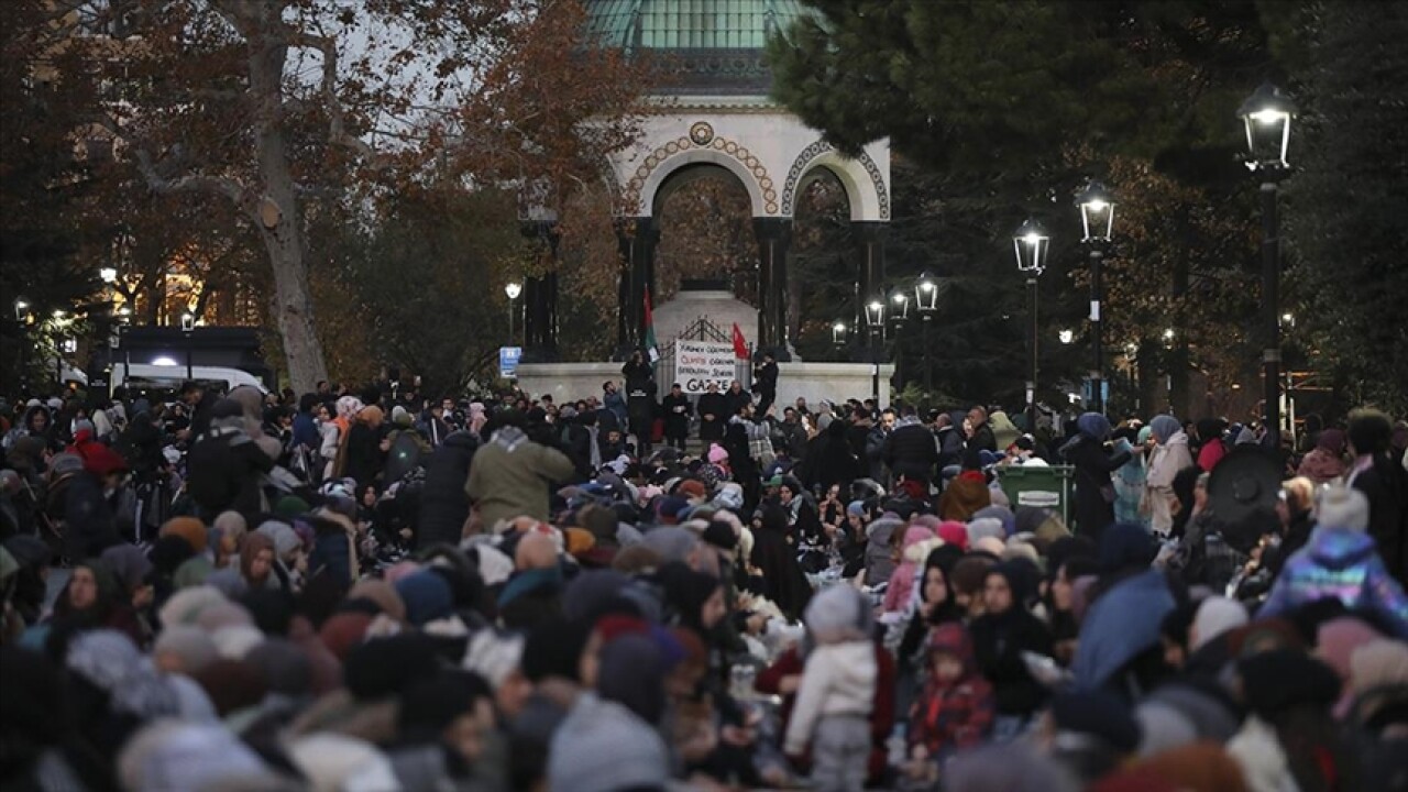 Sultanahmet Meydanı'ndaki programda, katılımcılara iftariyelik dağıtıldı, akşam ezanının okunmasıyla oruçlar açılarak Filistinliler için dualar edildi.