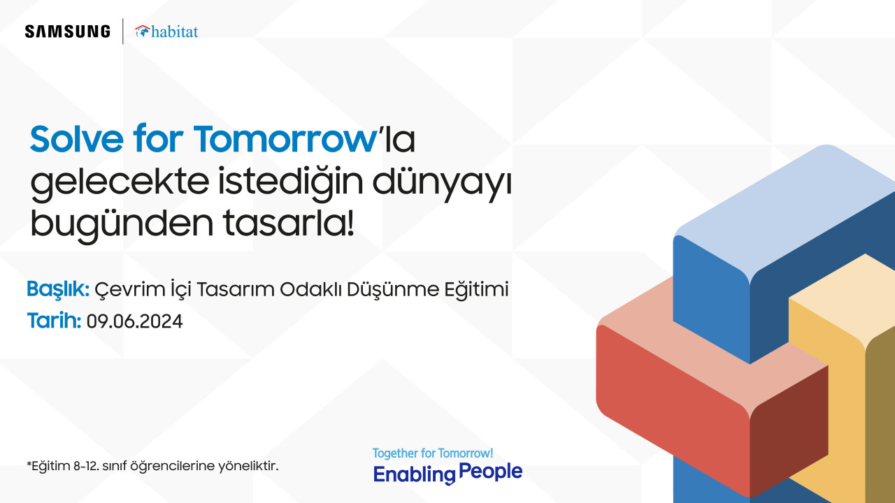 Samsung Electronics Türkiye ve Habitat Derneği tarafından sunulan, uygulama ve deneyim odaklı olarak interaktif bir eğitim içeriğine sahip. Tasarım Odaklı Düşünme Eğitimi hem yüz yüze hem çevrim içi olarak Solve for Tomorrow Elçi Eğitmenleri tarafından gerçekleştiriliyor. Eğitimler, Tasarım Odaklı Düşünme metodolojisinin beş adımı olan “Empati Kurma”, “Tanımlama”, “Fikir Üretme”, “Prototip Oluşturma” ve “Test Etme” aşamaları, öğrencilerin uygulayarak öğrenme becerilerini geliştirmeye yönelik bir yaklaşımla aktarılıyor. Samsung’un global müfredatına uygun olarak düzenlenen eğitimler, ortaokul ve lise öğrencilerinin (8-12. sınıf) eleştirel düşünme, iletişim, iş birliği ve yaratıcılık becerilerini geliştirmeyi amaçlıyor. Eğitim bitiminde öğrenciler katılım belgesi almaya hak kazanıyor.