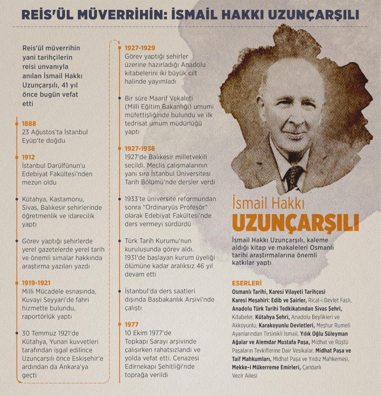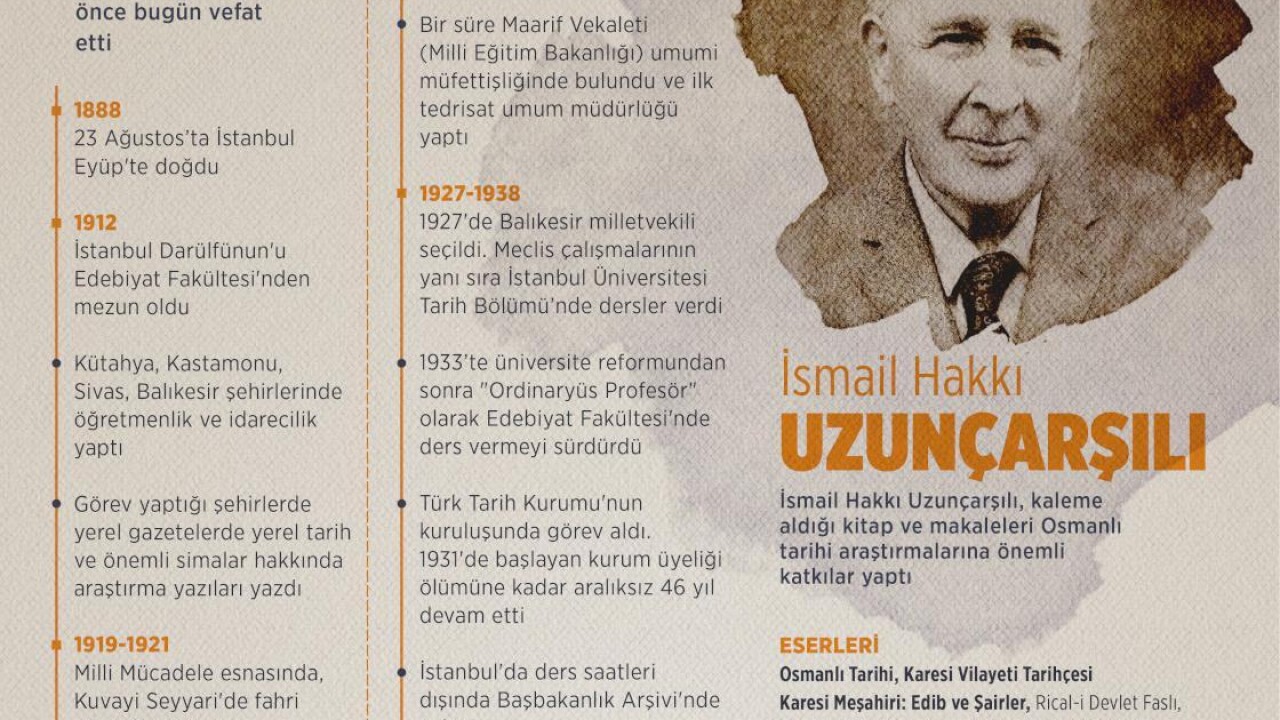 "Reis-ül müverrihin" (tarihçilerin reisi) unvanıyla anılan Osmanlı tarihçisi Ord. Prof. İsmail Hakkı Uzunçarşılı'nın vefatının üzerinden 47 sene geçti. Osmanlı ve Türk tarihine ilişkin yaptığı önemli çalışmalarla bilinen Uzunçarşılı, 23 Ağustos 1888'de Uzunçarşılı Mehmet Latif Efendi ile Ratibe Hanım'ın oğlu olarak İstanbul Eyüpsultan'da dünyaya geldi.